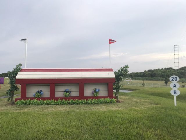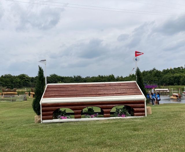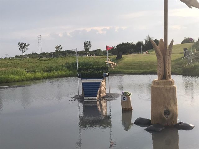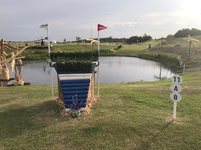 Fence 10, the Station House, will come as a relief - because it’s then once again back to water at fence 11abc, the Dragon Fly Pond. A really skinny brush-topped arrowhead is the first element, and there’s a second one of them just strides later in the middle of the pond. This could be a key question; a walk in the park for proper CCI5* horses, but there are plenty in the field without experience at that level.