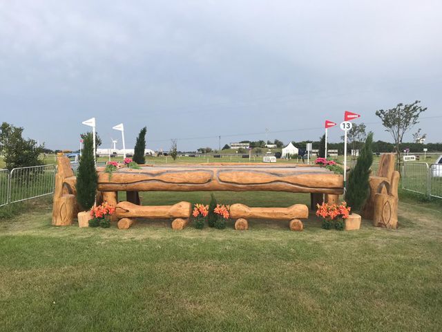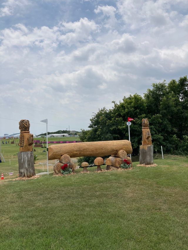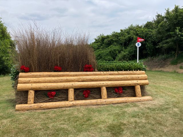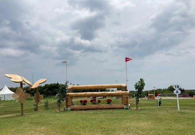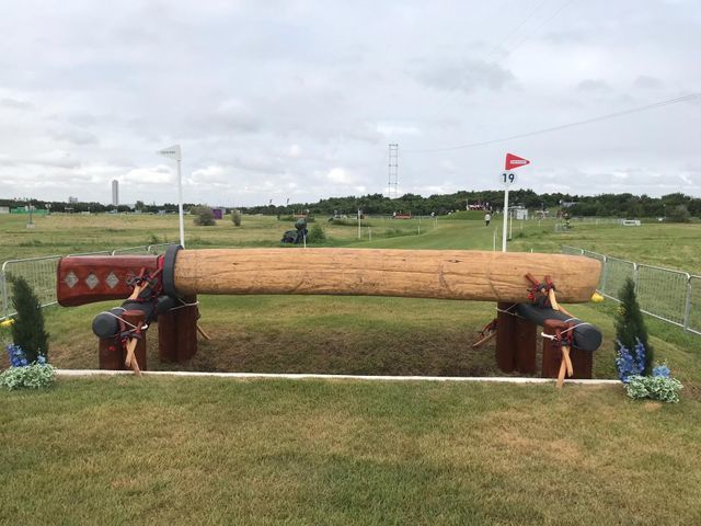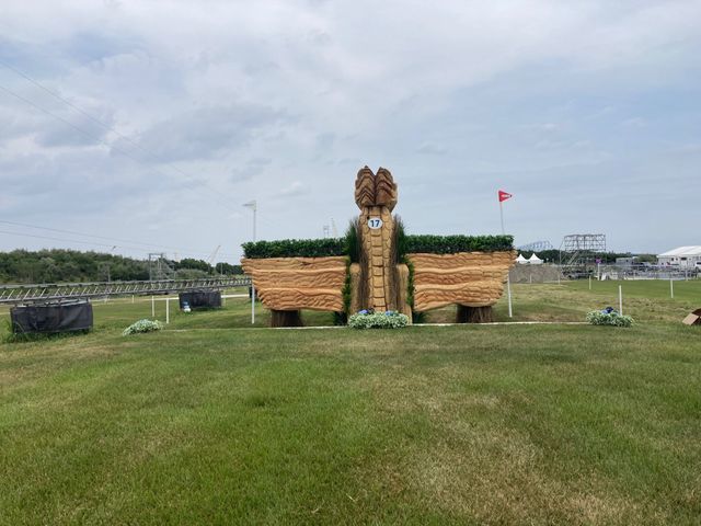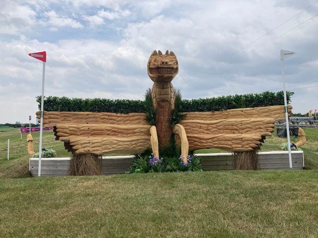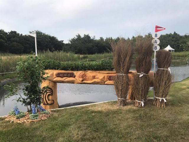 Fence 17, the Dragon - a stunning carved “dragon” with wings, with a ditch in front - is the sort of rider-frightener that won’t bother the horses one bit, and provides a let-up before the Bumps And Stumps at 18abcd. Undulating terrain has been created here and will test balance at this relatively late stage in the track; it adds difficulty to the fences, which are an oxer, a ditch, and angled tree stumps.