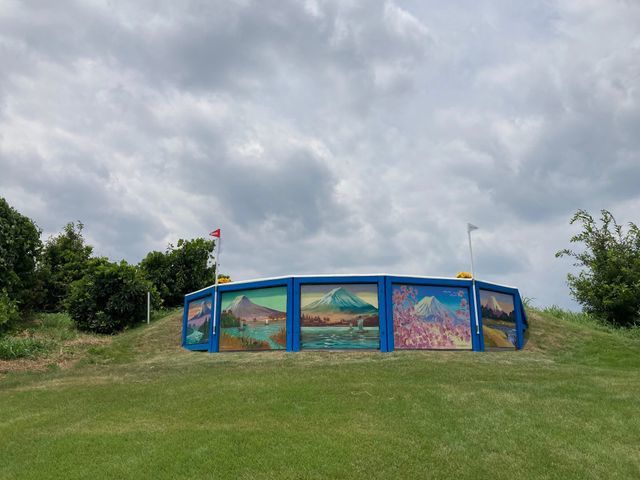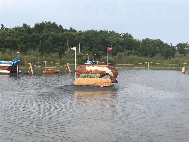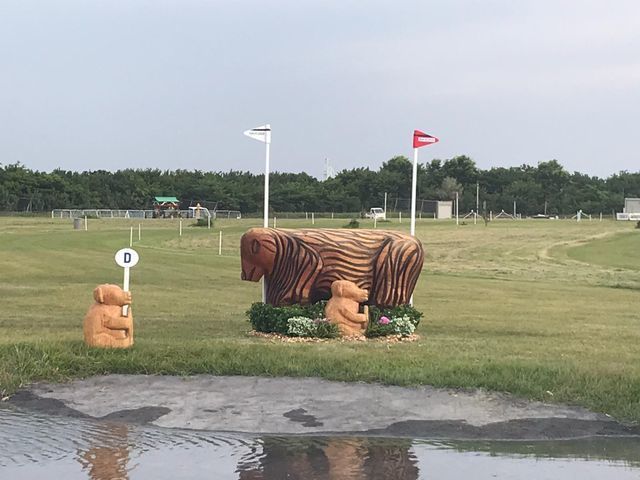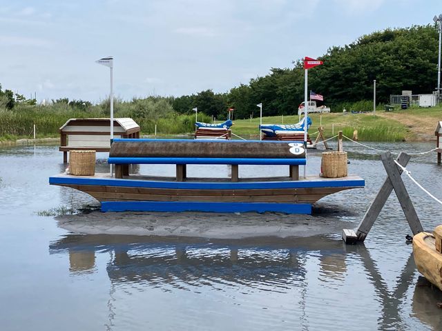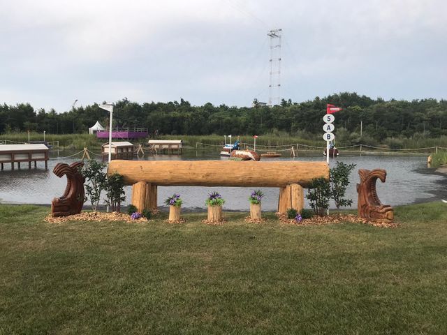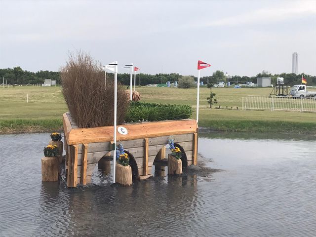 Yet again horses will be asked to turn back on themselves to the yawning Samurai Sword - suspended over a huge ditch - at 19, before the fourth and final water complex, the Mt. Fuji Water, at 20abcd. A painted rolltop oxer forms the first element, then the solid, brush-topped corner in the water is a serious question that will inevitably cause run-outs. The final part, a carved wooden animal, is just after the lip of the water on dry land again.