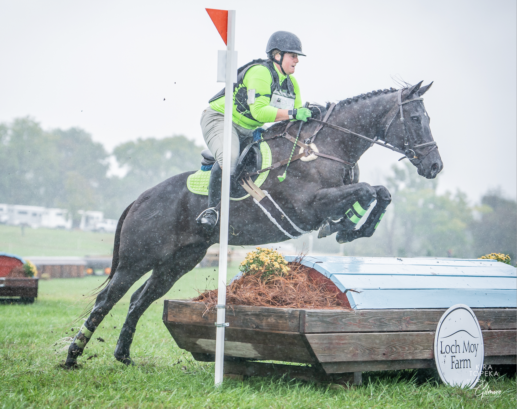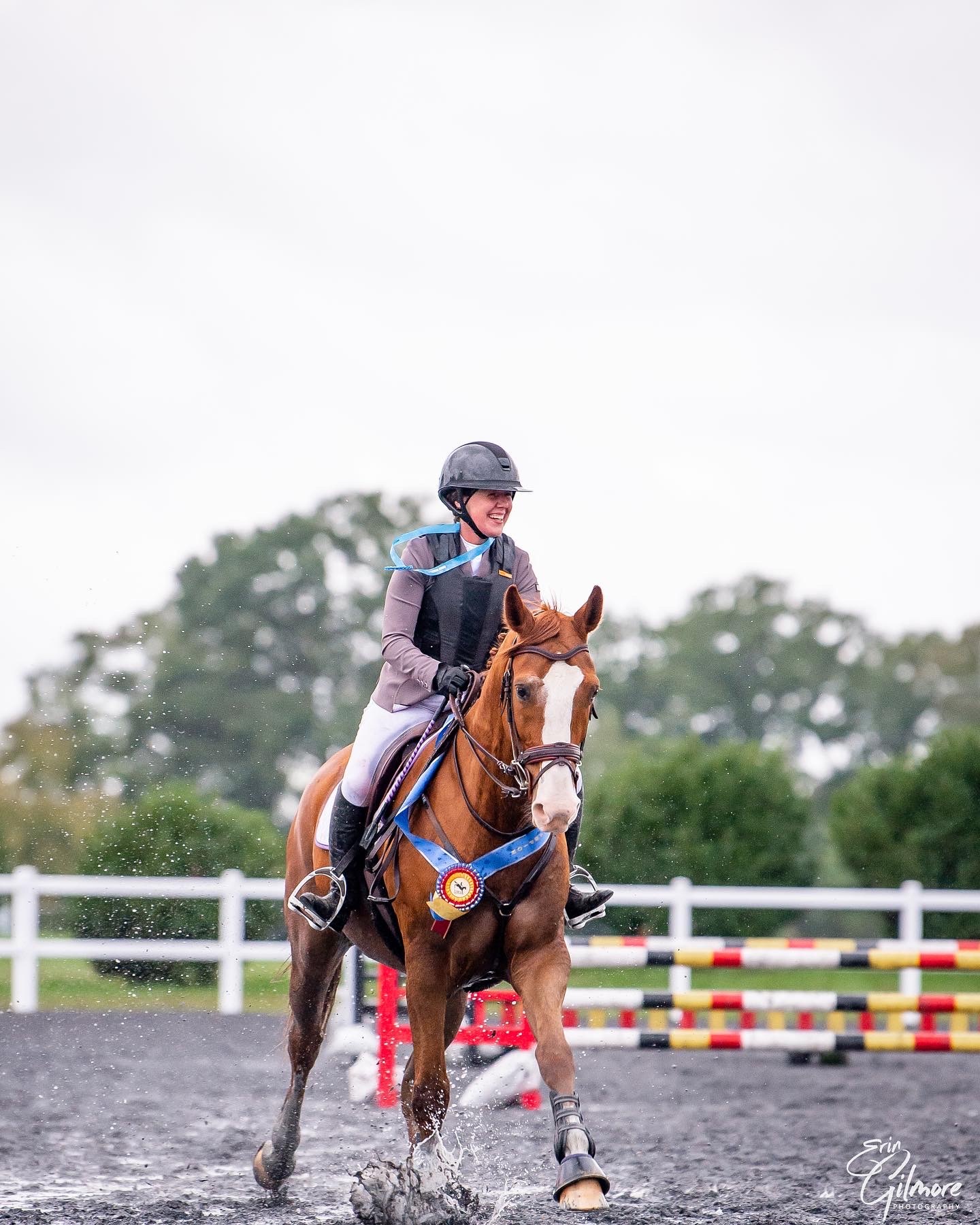 “Typically I would say that cross-country is my favorite phase. The entire day was a downpour and ‘Ari’ is a mudder, but for the Area II championships, it was show jumping that I will never forget. Going to warm up I was told I would be going last as the order of go was reverse order which was the first time we were first going into the final phase. As I watched the other horses go before me, I tried to focus on just my warmup with my trainer Jill Thomas and not look outside of the warmup ring. I walked down as late as I could so I wouldn’t have to watch, but the nerves kicked in and my dressage trainer was there at the in-gate and got me to focus on just what I needed to do in the next 90 seconds. The course I was comfortable with, but the triple wasn’t a question we have had in competition before. I trusted my schooling and preparation. Once I got over the first fence I was able to focus and after a one stride that Ari bailed me out on, I was focused on the triple and we nailed it. Now it was only a Liverpool and the last spooky fence. The liverpool wasn’t pretty, but we got it, and three strides out of the last fence I yelled at Ari to “get” and we sailed over it to the sound of applause. I was in shock as the last fence has gotten me before in big competitions before and it took a minute for it all to sink in.”