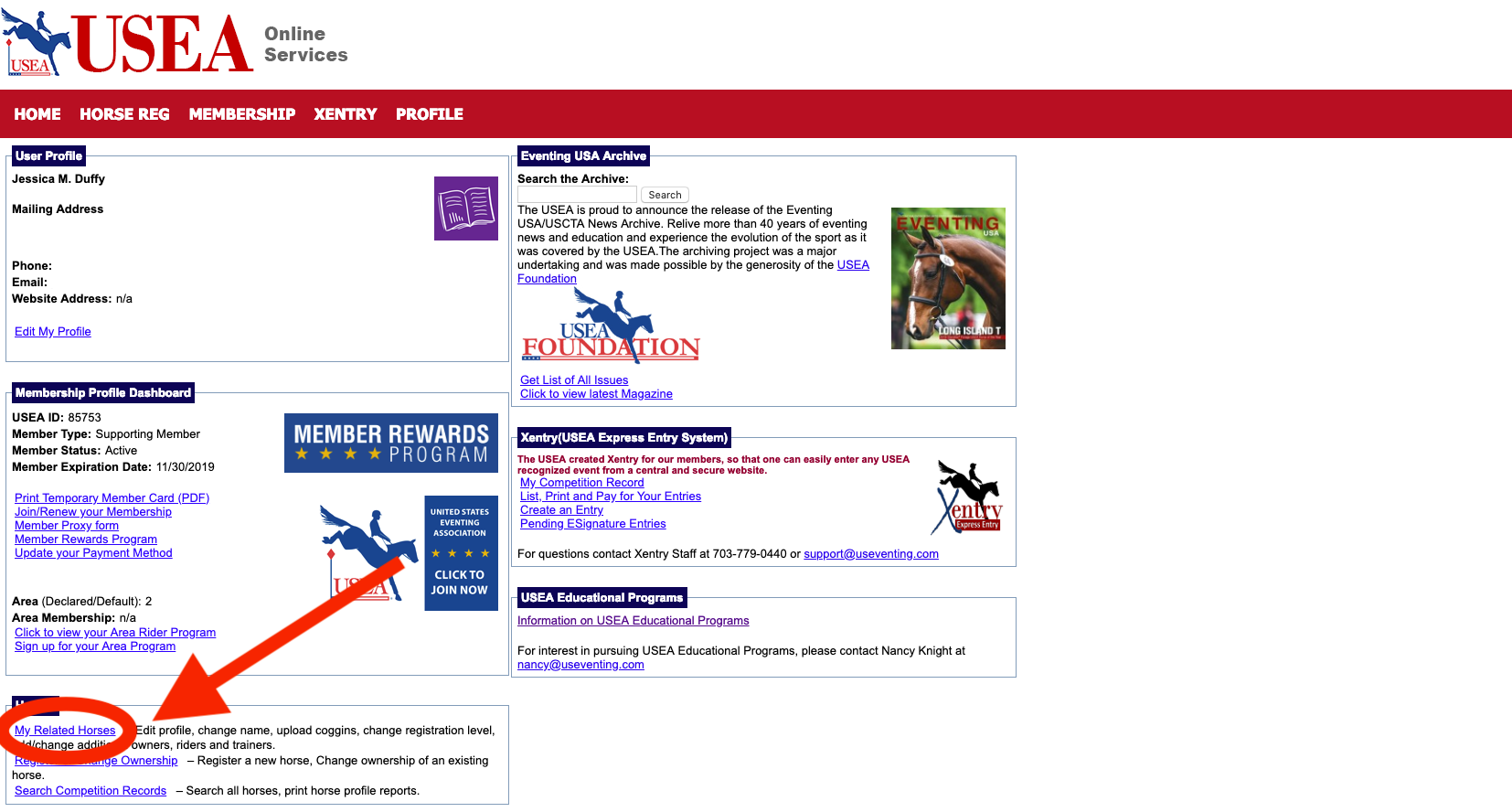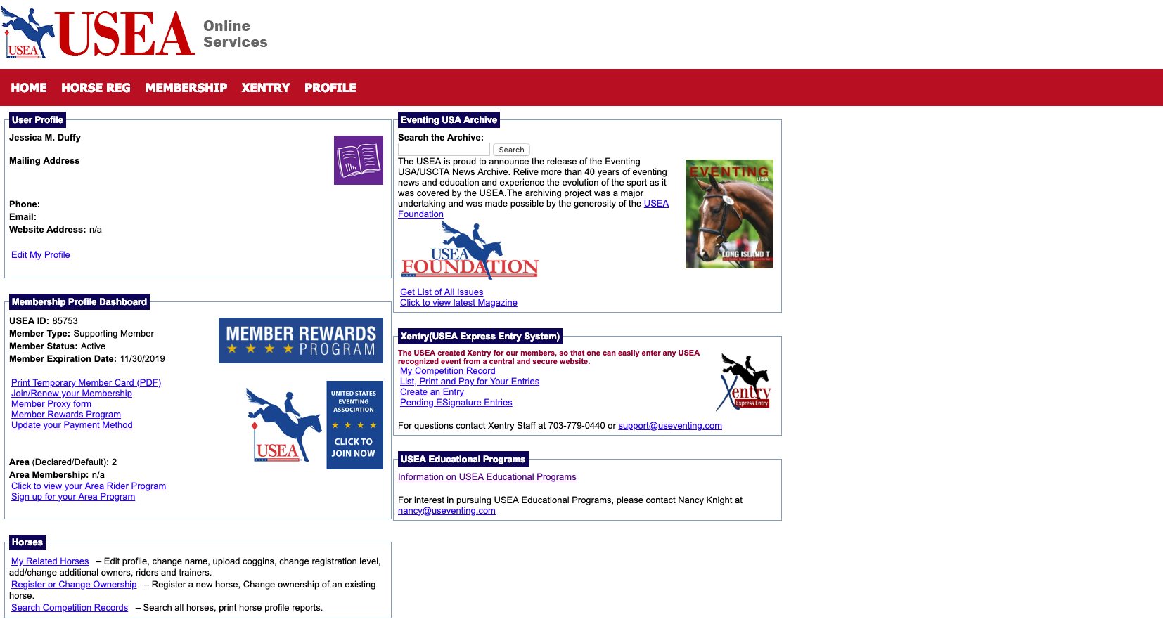 Once you’ve logged in, you’ll be directed to your Dashboard. Your USEA Online Services Dashboard includes links to edit your user profile, view and edit your related horse profiles, renew your membership, sign up for an event using Xentry, and more.