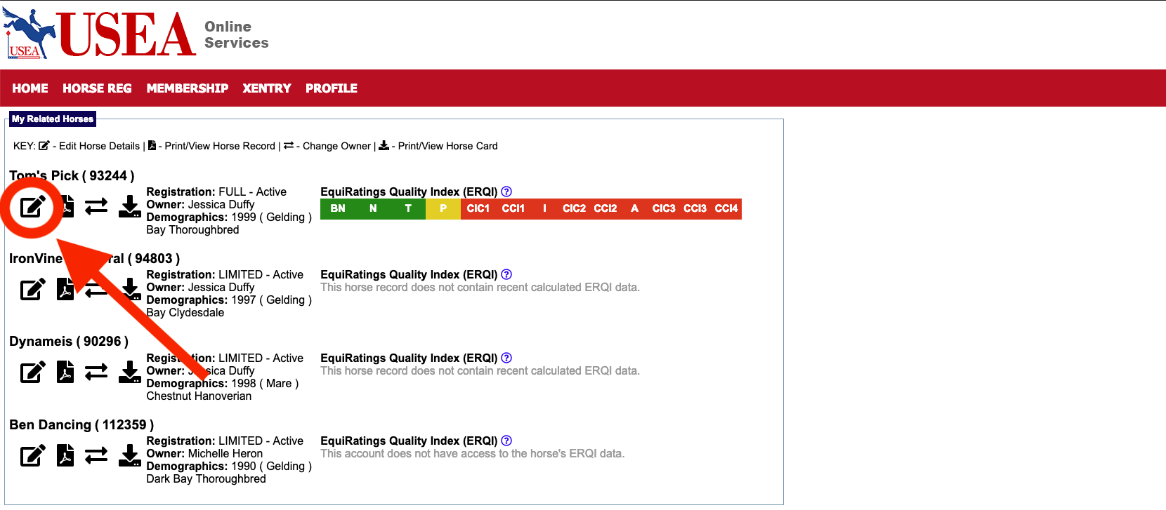 8. The My Related Horses page will display a list of horses you have registered with the USEA. From this page, select the paper and pencil icon next to any of the horses listed to update their information.