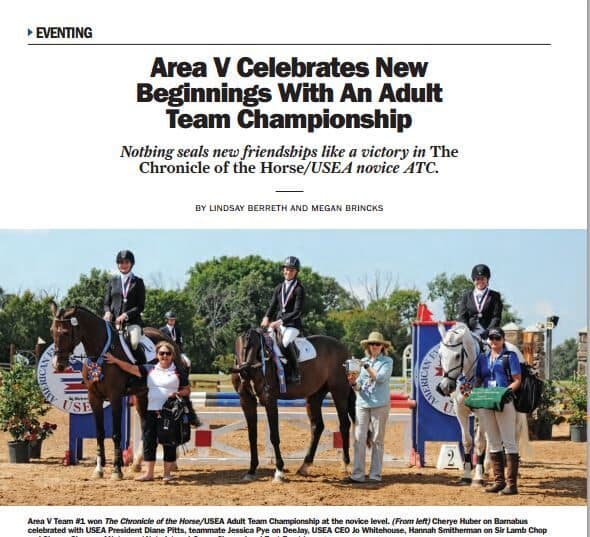 The 2014 USEA Adult Team Championship took place in coordination with the Nutrena USEA American Eventing Championships this year. Adult riders from all walks of life around the country came together to compete in a fun, friendly team environment. ATC sponsor The Chronicle of the Horse published a feature article about the winning teams in the October 13 issue of the magazine. Click to read!