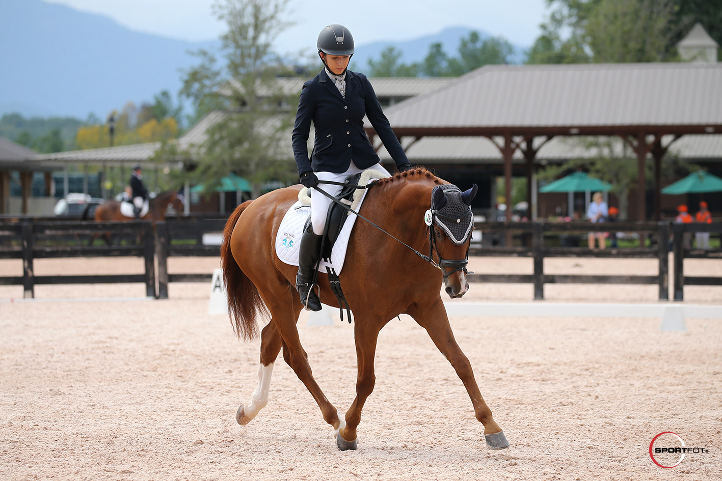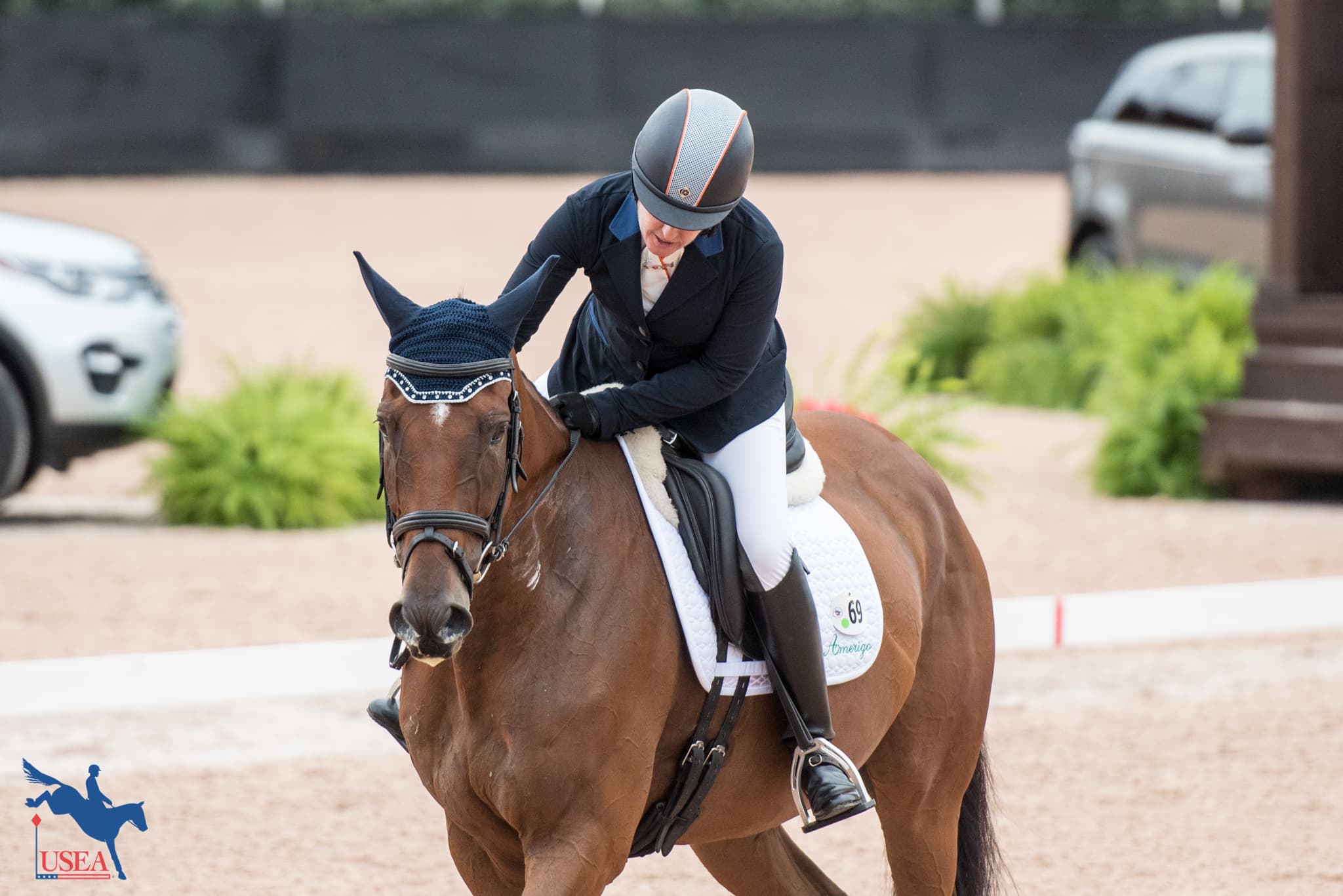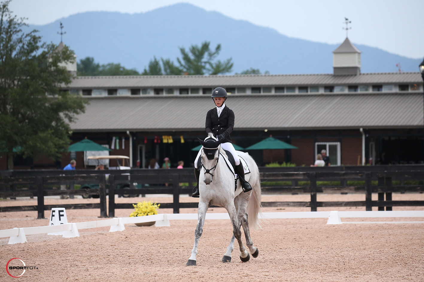 Denise Goyea rode Highlife's Je T'aime, a 9-year-old Oldenburg mare (Highlife's Der Dollar x Jeunesse D'or) to the top of the leaderboard in the Preliminary Rider division, scoring a 27.5. The mare is owned by 12-year-old Madeline Hartsock, who is currently leading the Junior Training division aboard her pony, Prinz S.W.