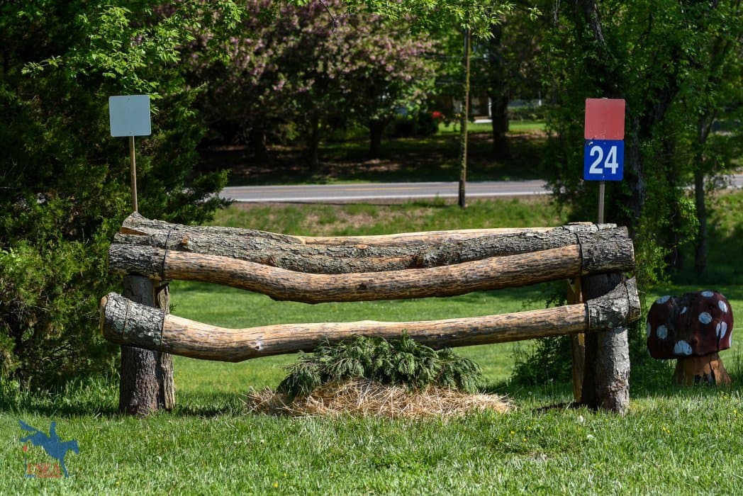 At this point, riders are approximately two-thirds of the way around the course, but there is still plenty of work to do before they pass through the finish flags. Riders proceed to the left into the back field once more to fence 21, an open oxer, and fence 22AB, an imposing ditch brush to a skinny wedge. The track proceeds back up the hill and over the gate at fence 23, then back through the trees and down the hill to the cherry rails at fence 24.