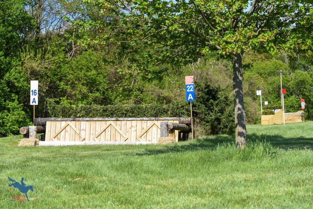 This takes riders into the back field, where they jump the offset brushes at fence 16AB and pick up the two gallop fences at 17 and 18 before turning right and galloping down to 19AB. The log at A and the corner at B are set on mounds with a dip in the middle, meaning riders will have to navigate the terrain between the two fences while holding their line. A sweeping right-hand turn brings riders to the Back Bay at fence 20.