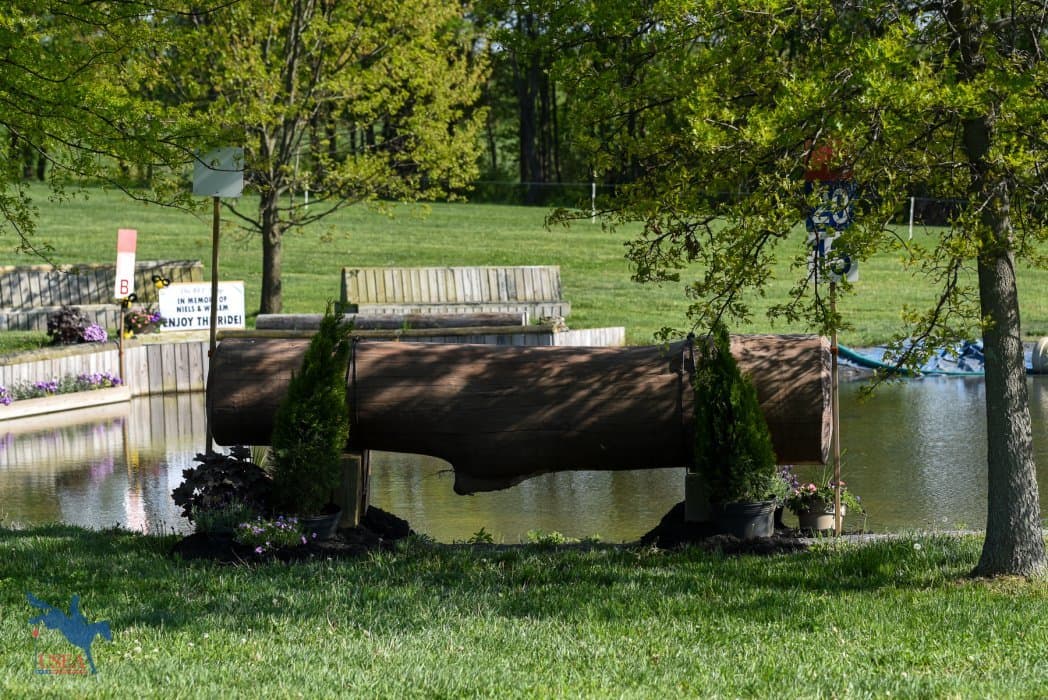 Back through the tree line and to the left, riders jump fence 6 and continue on to fence 7AB, two left-hand corners. Riders proceed downhill over fence 8, the cedar table, and through the tree line yet again before coming to the newly designed Jersey Shore water complex. This year at the Jersey Shore, riders jump in over a cabin and proceed through the water and onto the island in the middle, where they jump the two skinnies at 9B and C, before passing through the water again.