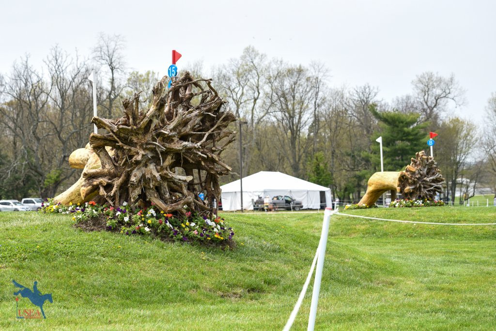 Fence 14, the Loblolly Pine Rails take riders slightly downhill before curving up and to the left to fence 15AB, the Fallen Trees. These two trees sit on mounds with a dip in between, meaning riders must navigate the terrain in addition to the angled logs. From there riders jump fences 16 and 17, the Cedar Lodge and the Waterview Cabin, on their way to the Land Rover Head of the Lake.