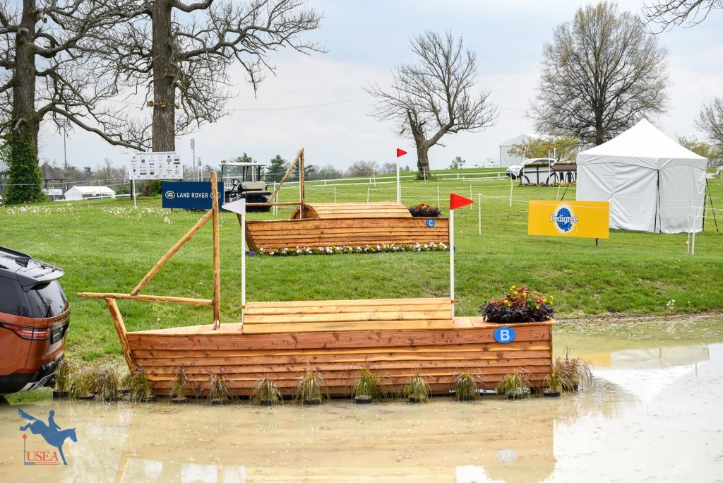 Riders come out of the box and curve to the left over fence 1, “Red, White, and Bluegrass” before heading up a gradual rise to fence 2, the Market Table. The course then curves downhill and to the right over the Double Brush before turning right into the first combination, the Water Park at 4ABC. Riders jump over the upright rails, canter downhill into the pond and over the angled boat in the water before bending left up the hill and out of the water over the second boat.