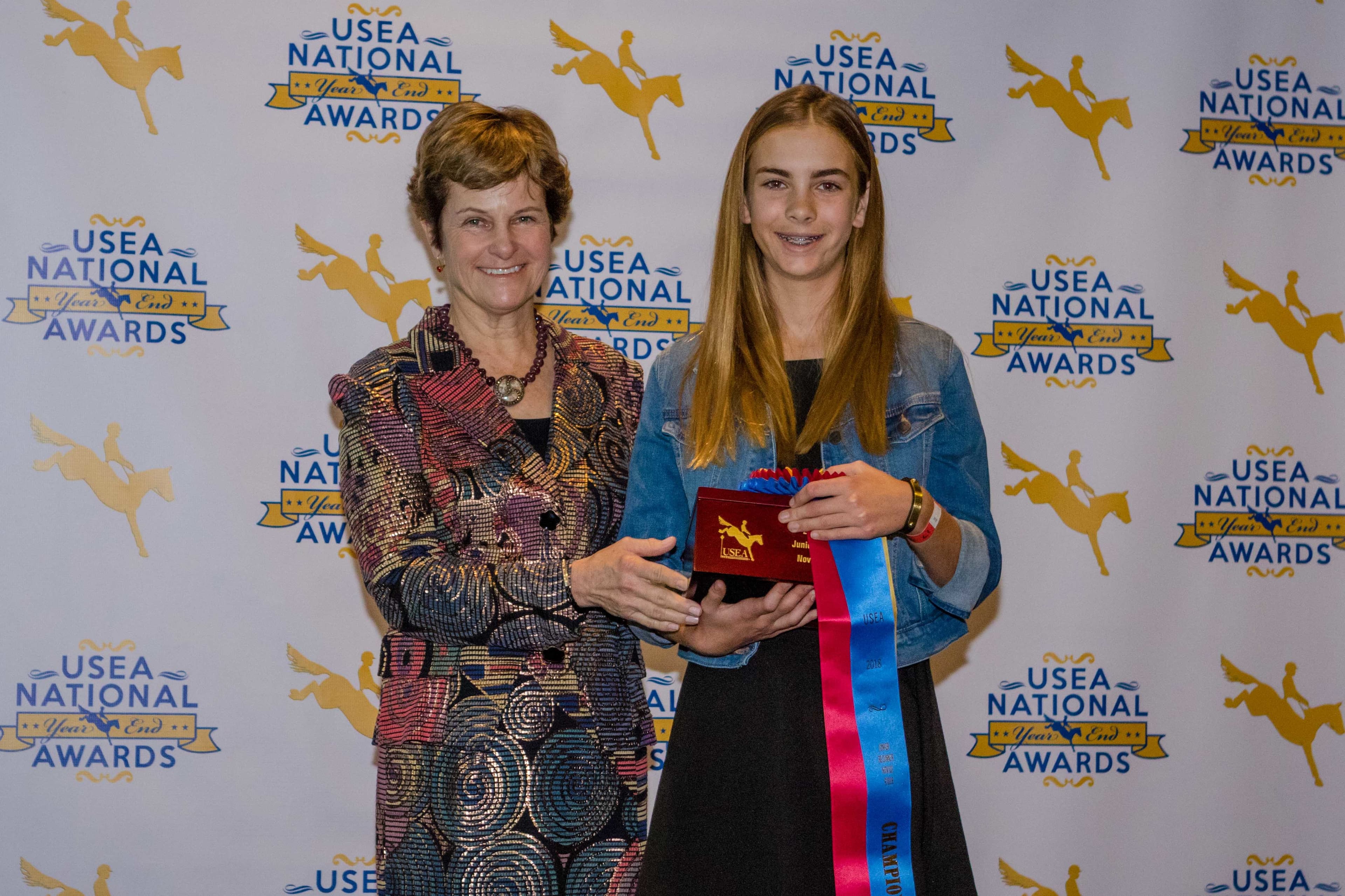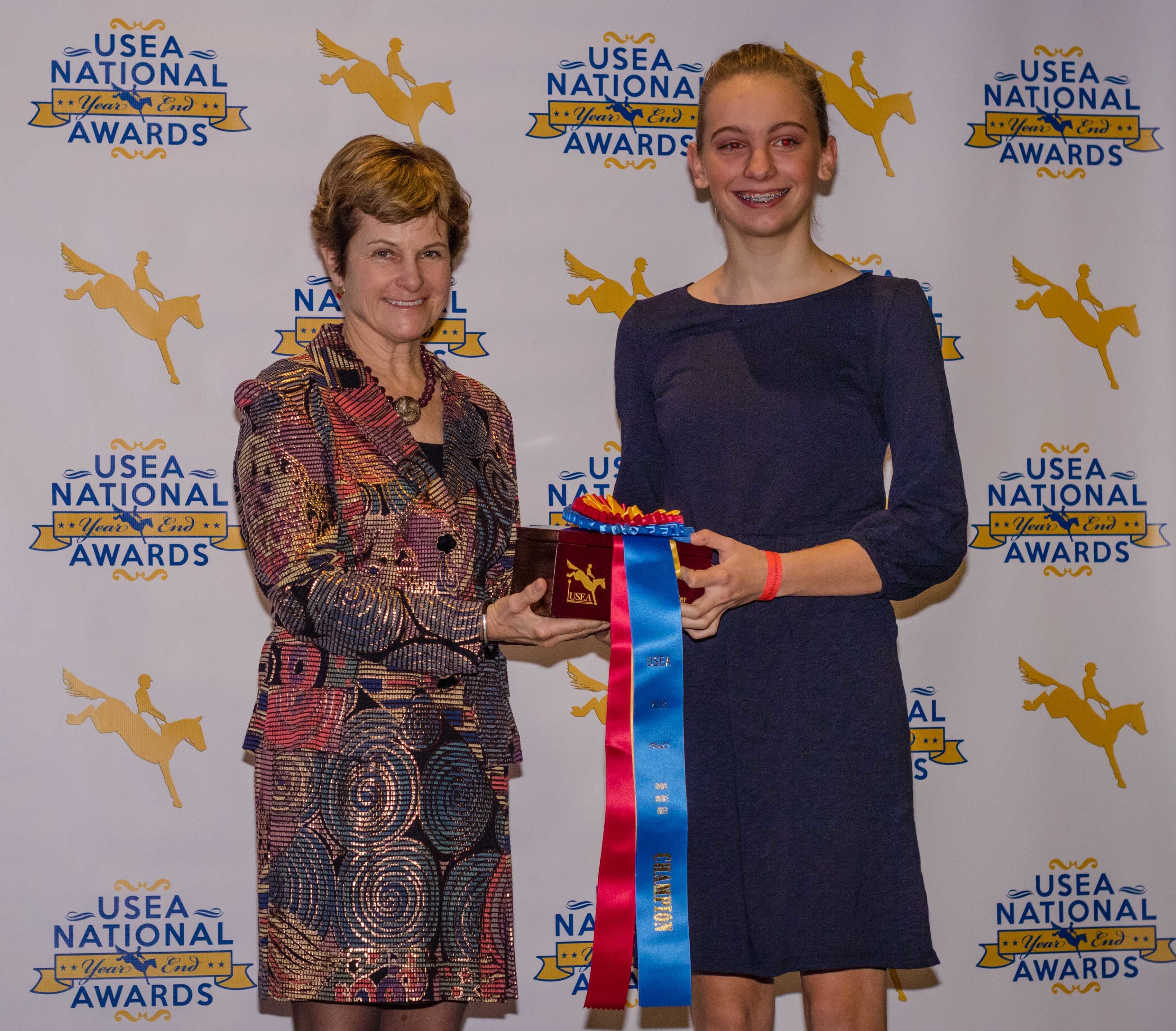 Kozlowski then presented the Charles Owen Technical Merit Awards. Created to encourage safe and appropriate cross-country riding, the Charles Owen Technical Merit Awards are presented to one junior and one adult amateur rider at the Training level at one event in each of the 10 USEA Areas during the year. The highest scoring junior and highest scoring adult amateur at each event are awarded a Charles Owen Body Protector and a helmet bag, and the overall highest scoring junior and adult amateur from all 10 events of the year each receive a voucher towards a Charles Owen helmet. The highest scoring adult amateur was Annika Weisjahn (Hugo, Minnesota) riding The Flying Iris and the highest scoring junior was McKayla Mattison (Spring Valley, Wisconsin) riding A Sky Full of Starz.