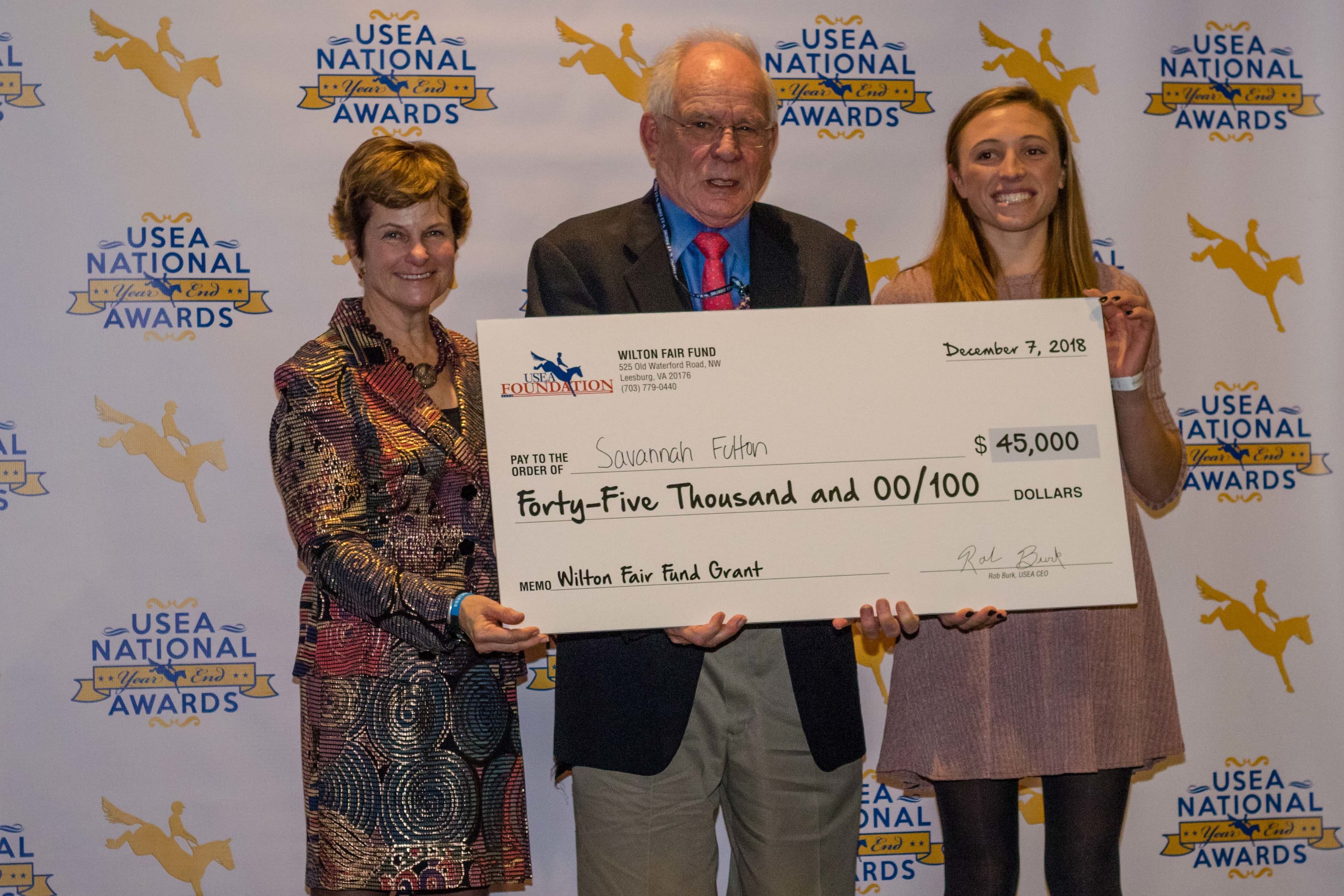 The Wilton Fair Grant is donated by David and Cheryl Lenaburg with the goal of supporting U.S. developing riders. The Fund allows up to $100,000 in grants to be given each year for a variety of educational opportunities for riders 29 and under who have not yet ridden for a senior team. Three Wilton Fair Grants were presented this year. Two grants for $6,000 each were presented to Mia Farley (San Juan Capistrano, California) and Madison Temkin (Sebastopol, California). The $45,000 2019 Wilton Fair Grant was presented to Savannah Fulton (Ocala, Florida).