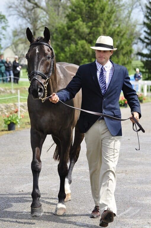 After a brief delay due to a tornado watch and heavy storms in the morning, the first horse inspection at the Rolex Kentucky CCI4* in Lexington, Kentucky kicked off the 2011 event at 11AM. Both Kelly Sult’s Hollywood and Kristin Bachman’s Gryffindor were held, but passed upon re-inspection. Phillip Dutton did not present Tru Luck. Forty-five horses will be going forward to compete this weekend. Leslie Threlkeld photo. Pictured Boyd Martin & Remington XXV.