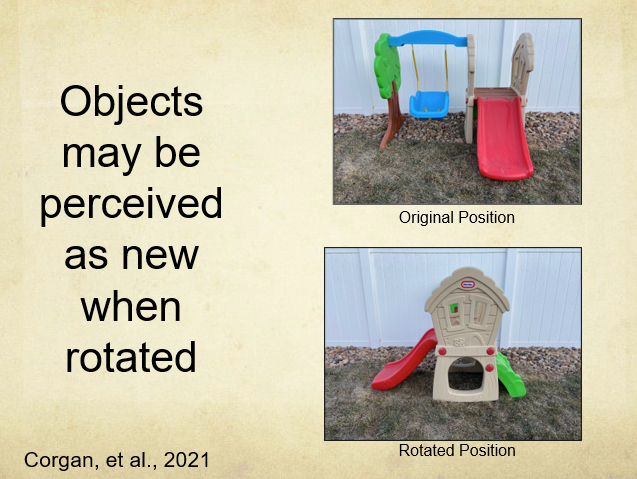 “This is an interesting study that one of my students did that explains why a horse might suddenly spook. If you look at this playset, you will notice that it looks totally different when it's rotated. My students walked young fillies and colts past this playset 15 times at the walk, until the horses just walked by it without stopping, raising their heads up, or flaring their nostrils. When this thing was turned, it became a new thing. It became something different.”