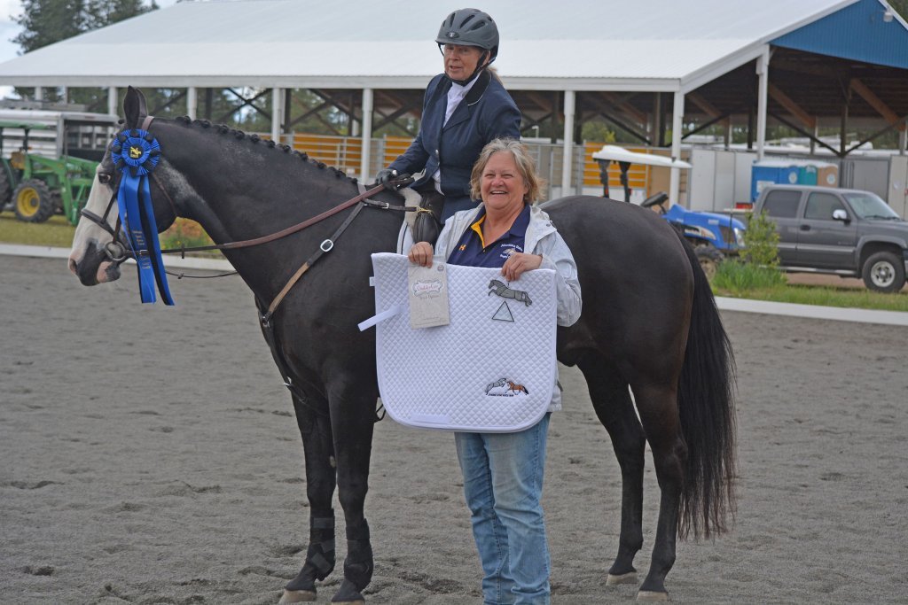 SSHF owner Christel Carlson presented Mary with a farm logo show pad, specially designed for the event stained glass jumping horse the division winners receive, new stock tie donated by Sponsor Chubby Cov and Cindy Covington and a large championship blue ribbon as our first century ride. Cyra Carlson Photo.