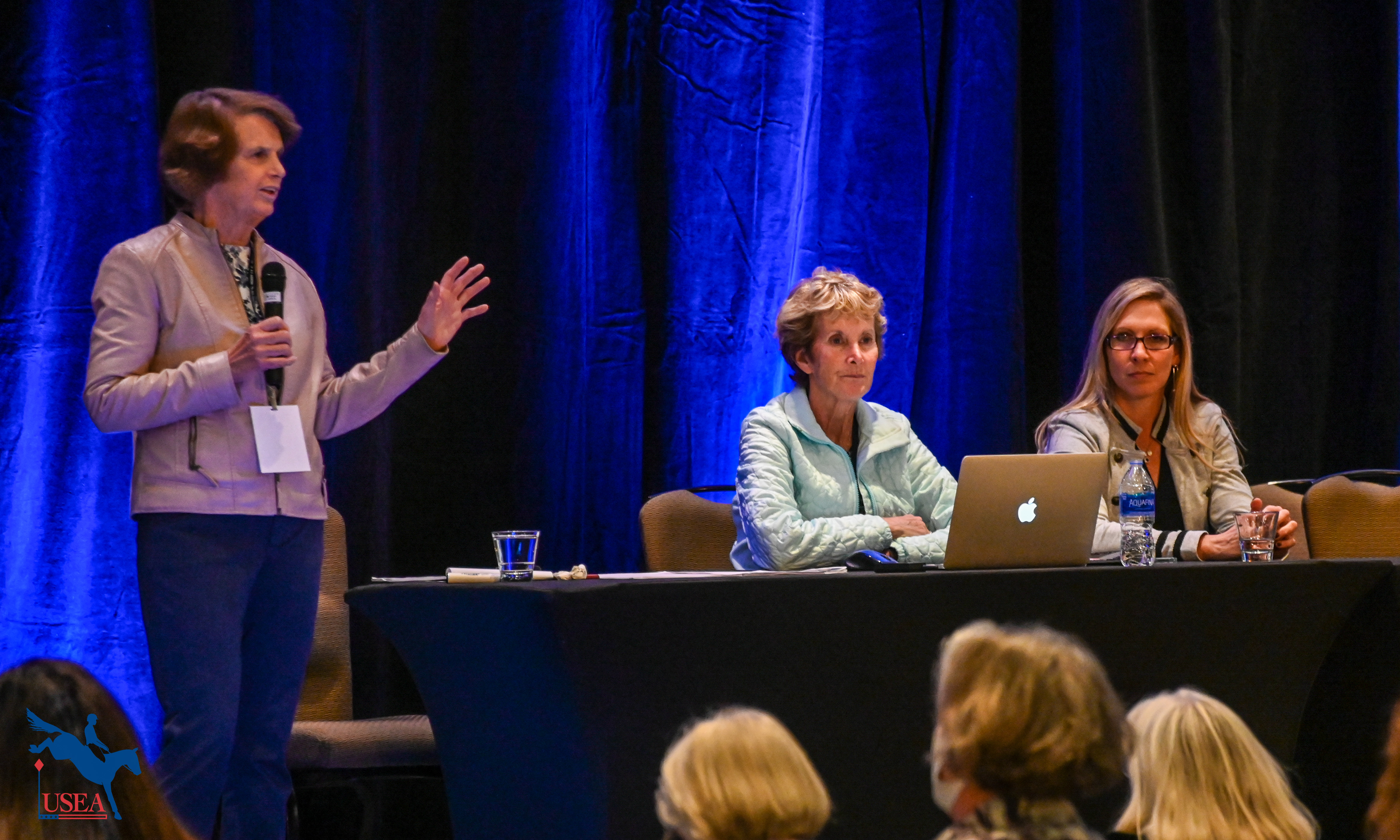 Marilyn Payne, chair of the Test Writing Task Force, presented the 2022 USEF Eventing Dressage Tests at the 2021 USEA Annual Meeting & Convention in Albuquerque, New Mexico. During her session, Payne discussed reasonings behind certain movements, updates for clarity that were being made (updated tests have since been published and may be reviewed here), and even shared video demonstrations of certain tests to help attendees get a better understanding of what to expect this competition season.