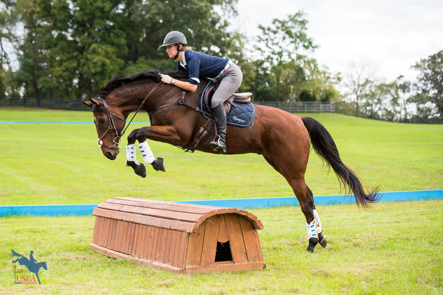 To end each session, Dutton gave riders a course that would require them to adjust between a bold, galloping stride and a shorter, quicker stride. Riders would begin over a series of cross-country or galloping fences and then have to shorten the stride for an accuracy question, such as an angled line to a corner, or a bending line from oxer to corner. “There are all different kinds of approaches and all different kinds of riding,” Dutton reminded the riders, encouraging them to select the approach and type of ride most appropriate for each question on course. “I want you all to think about the canter you have underneath you, stay in the moment, and react to what your horse is doing.”