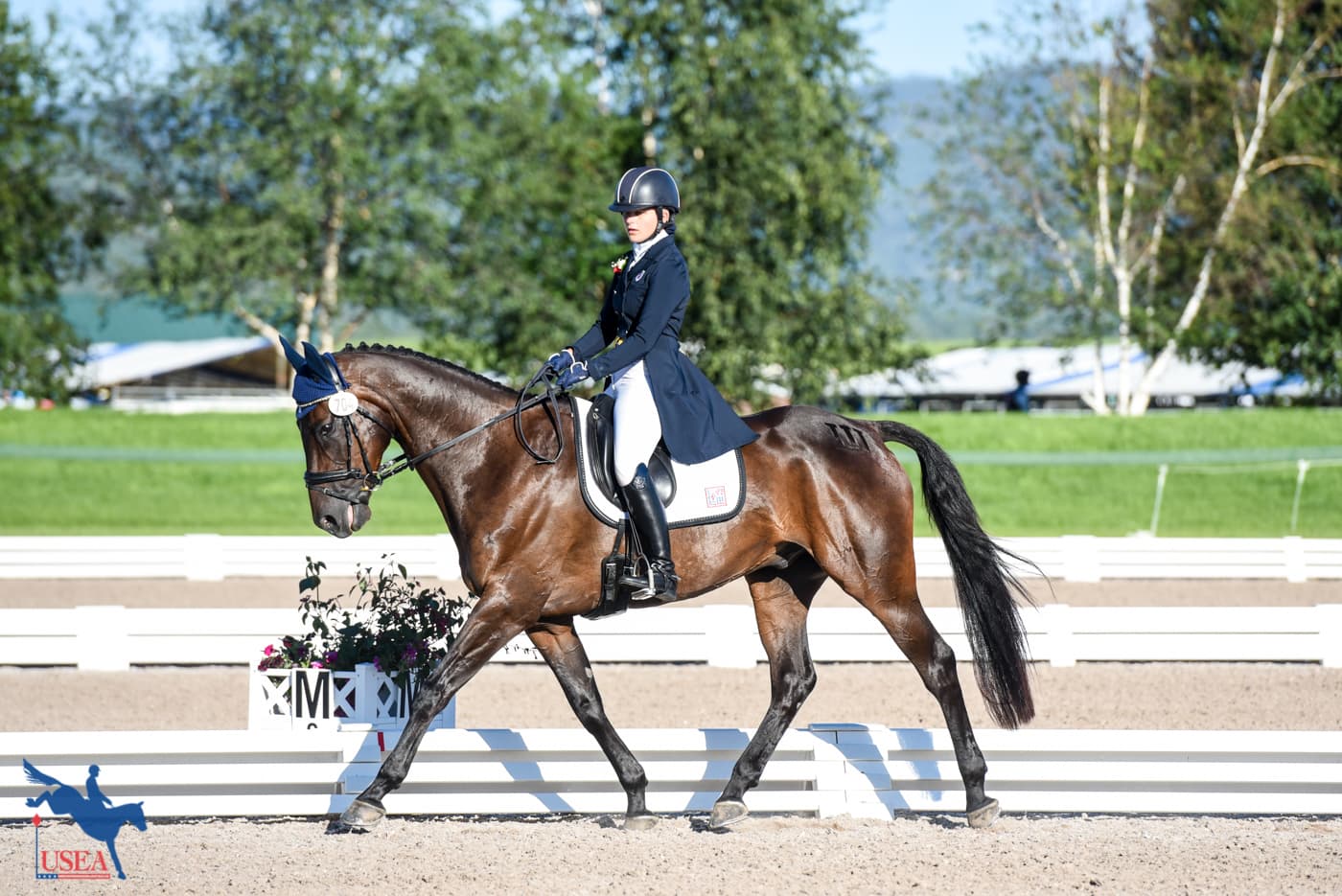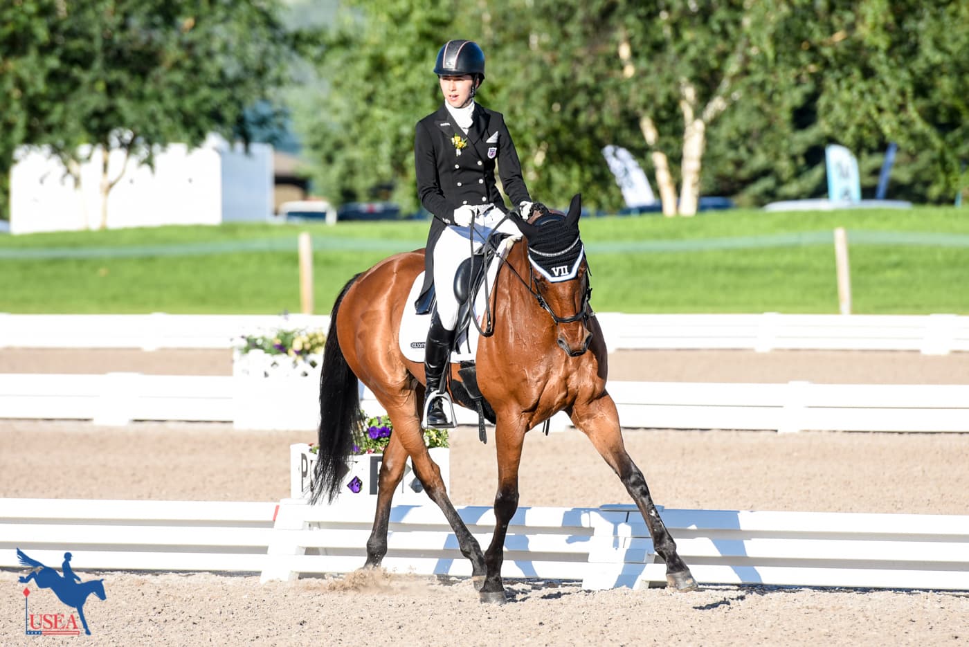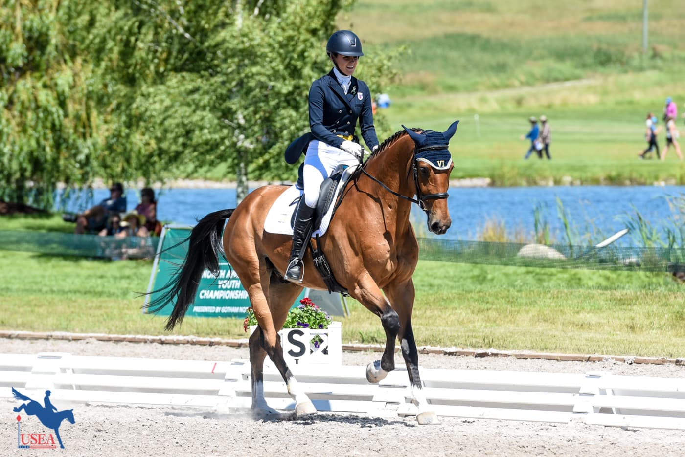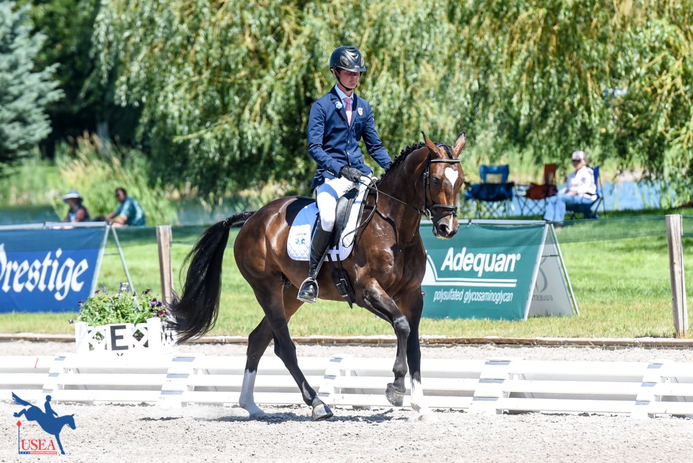 With Babbitt topping the leaderboard and Henry and Pellegrini tied for second place, it’s Area IV’s Benjamin Noonan who holds the next spot on the individual leaderboard. Noonan and his 8-year-old Hanoverian mare, Keep Kitty (King Julio x Emelie) had a lovely test, scoring a 27.0. The two have had a long partnership, as Noonan explained that he was 12 years old when he got ‘Kitty’ as a 5-year-old. “She’s a very old soul, and she’s been taking care of me,” Noonan explained. “We actually got a call saying we needed to buy this horse, so we bought her without ever riding her. When she came to the U.S. I rode her for the first time and I got bucked off,” Noonan said while laughing. “So my parents were really worried, but now it’s turning out really well. She’s been great and it’s cool to take her here [at NAYC] and have her ride like a real horse that goes to Young Riders.”