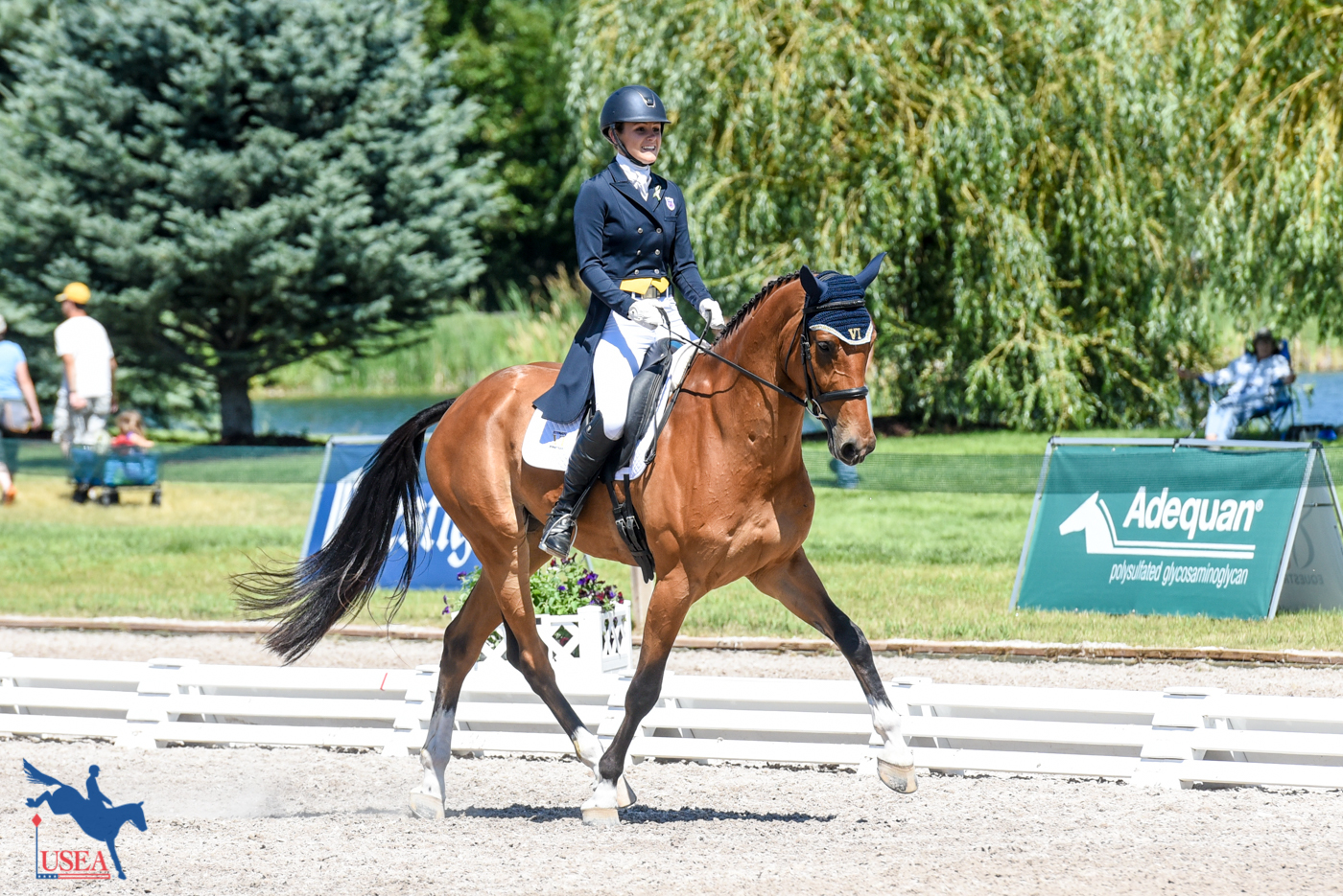Area VIII’s CCIJ2*-L team sits in second place after dressage on a cumulative 87.8, with Elizabeth Henry as their leading scorer. Henry and her own 11-year-old Warmblood mare Charlotte La Bouff charged down the centerline, claiming a 24.9, to sit tied in individual second place with Area VI’s Pellegrini. “I was super happy with my ride. It wasn’t perfect, but definitely one of our best tests,” explained Henry. “She went in there fully game, and I rode her to the best of my ability. I’ve had her almost three years, and she’ll do anything for you, so I just had to know what I needed to do to go in there and I knew she’d do it.”