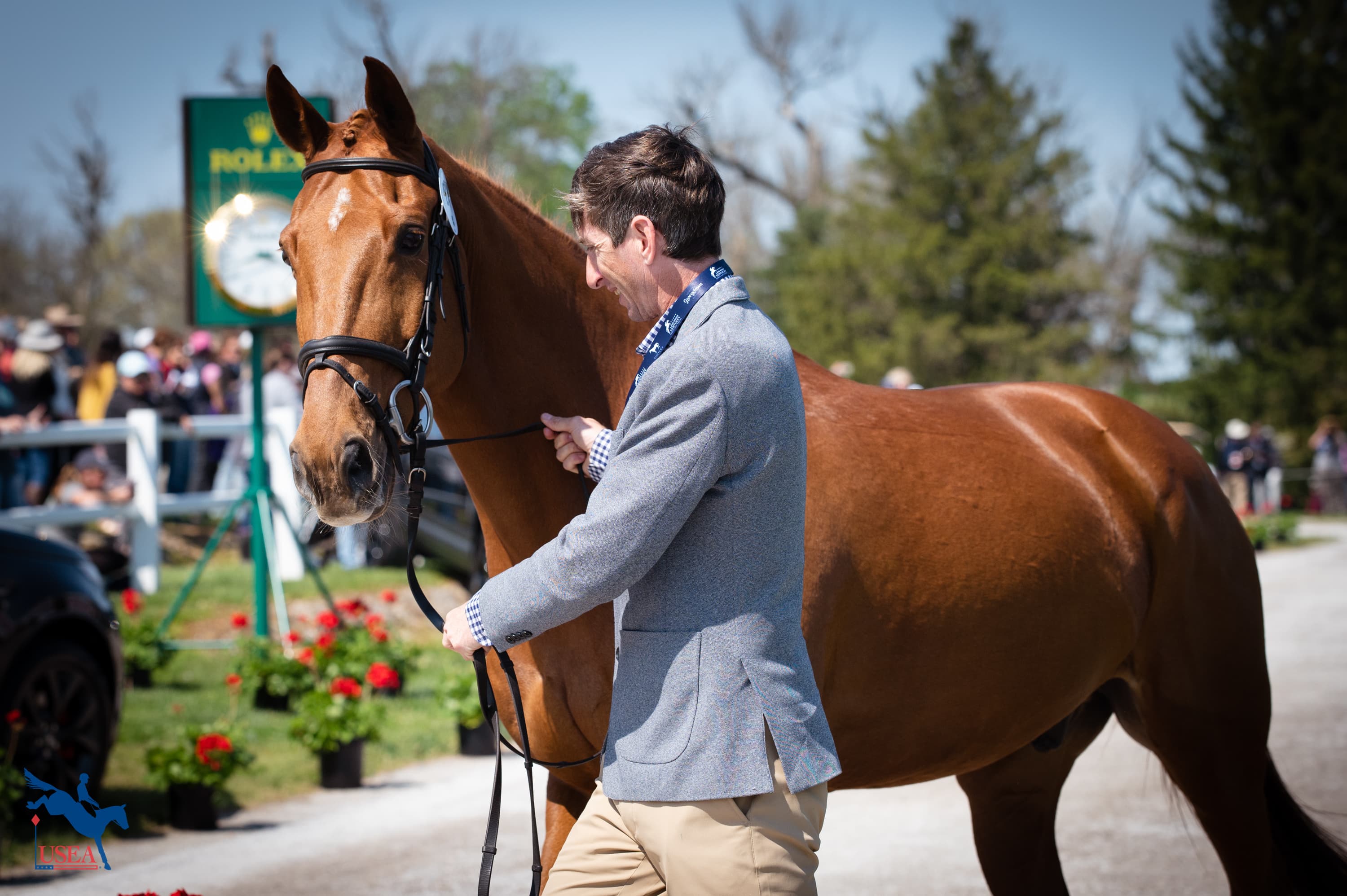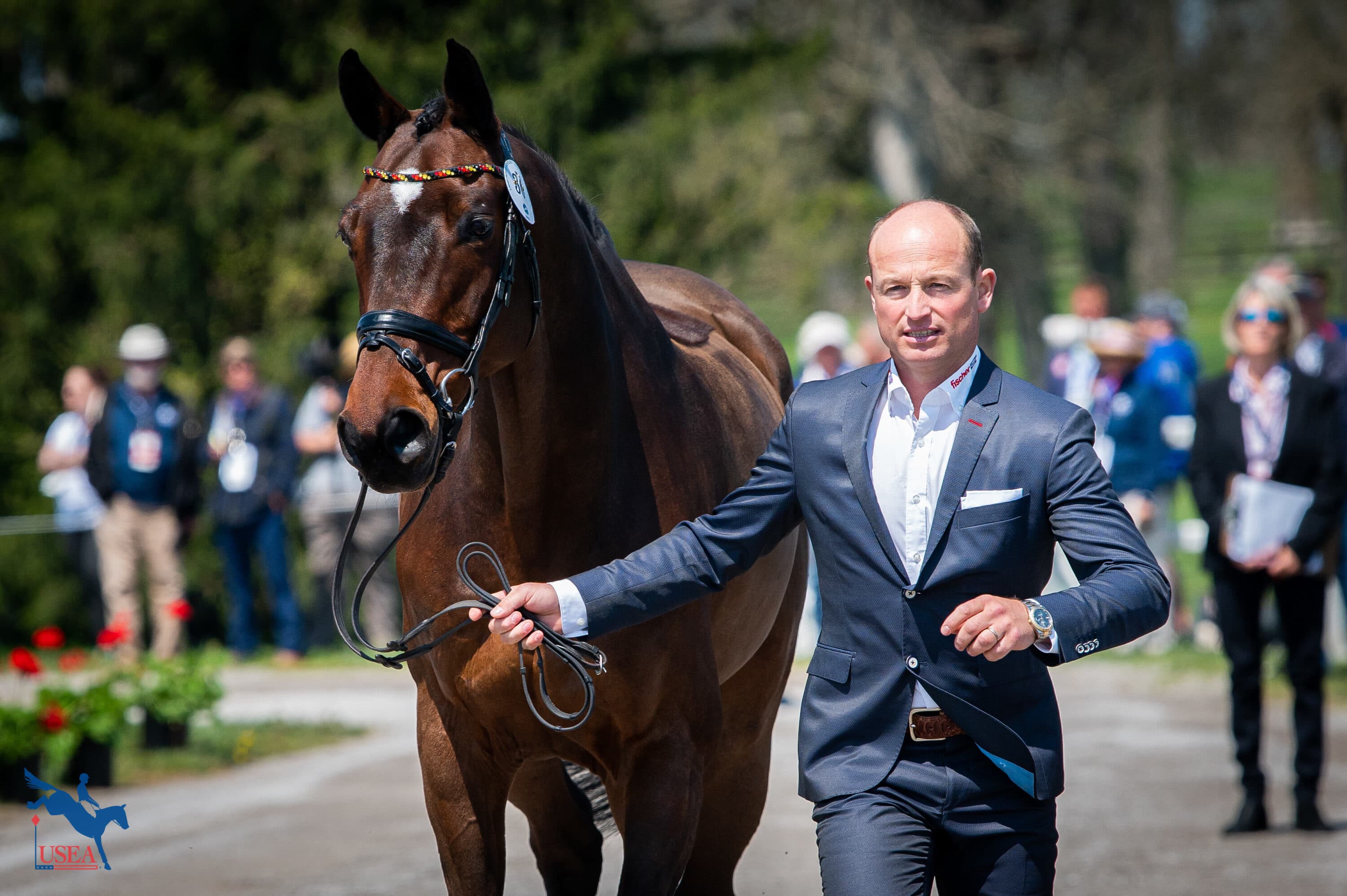Pippa Funnell was first to present with her two horses, the 15-year-old Irish Sport Horse gelding Majas Hope (Porter Rhodes x Brown Sue) who she co-owns with Marek Sebestak and the 12-year-old Swedish Warmblood gelding Maybach (Jaguar Mail x Lady Micra) owned by S.H.E Eventing. Michael Jung and the 14-year-old Hannoverian gelding Fischerchipmunk FRH (Contendro I x Havanna) owned by Sabine and Klaus Fischer, Hilmer Meyer-Kulenkampff, and DOKR presented shortly after. This means the only two Rolex Grand Slam winners will compete head-to-head for the first time in the Land Rover Kentucky Three-Day Event CCI5*-L. Although they both competed at WEG in 2010, the last time Funnell competed at the Kentucky Three-Day Event CCI5*-L was in 2003, and the last time Jung competed was in 2018.