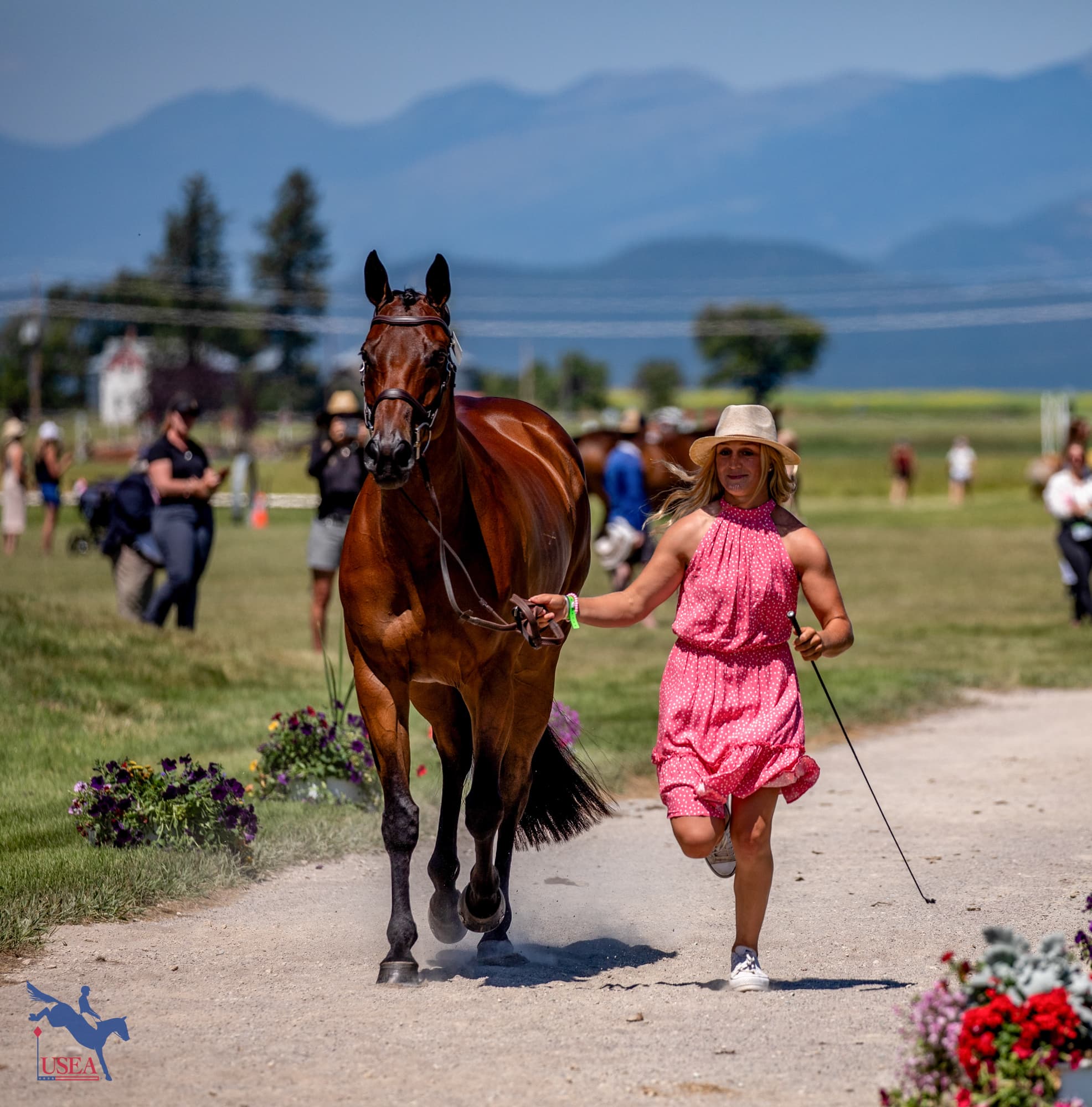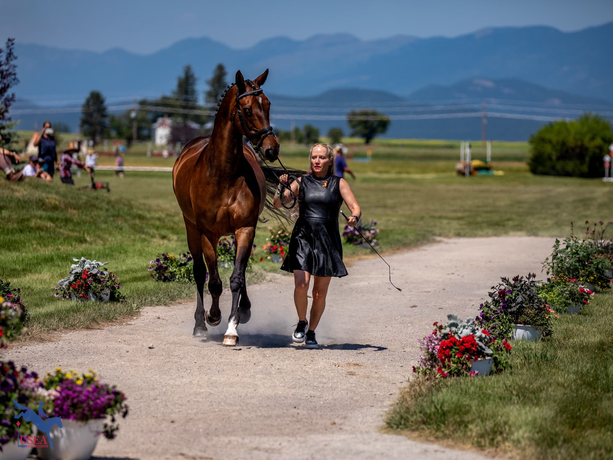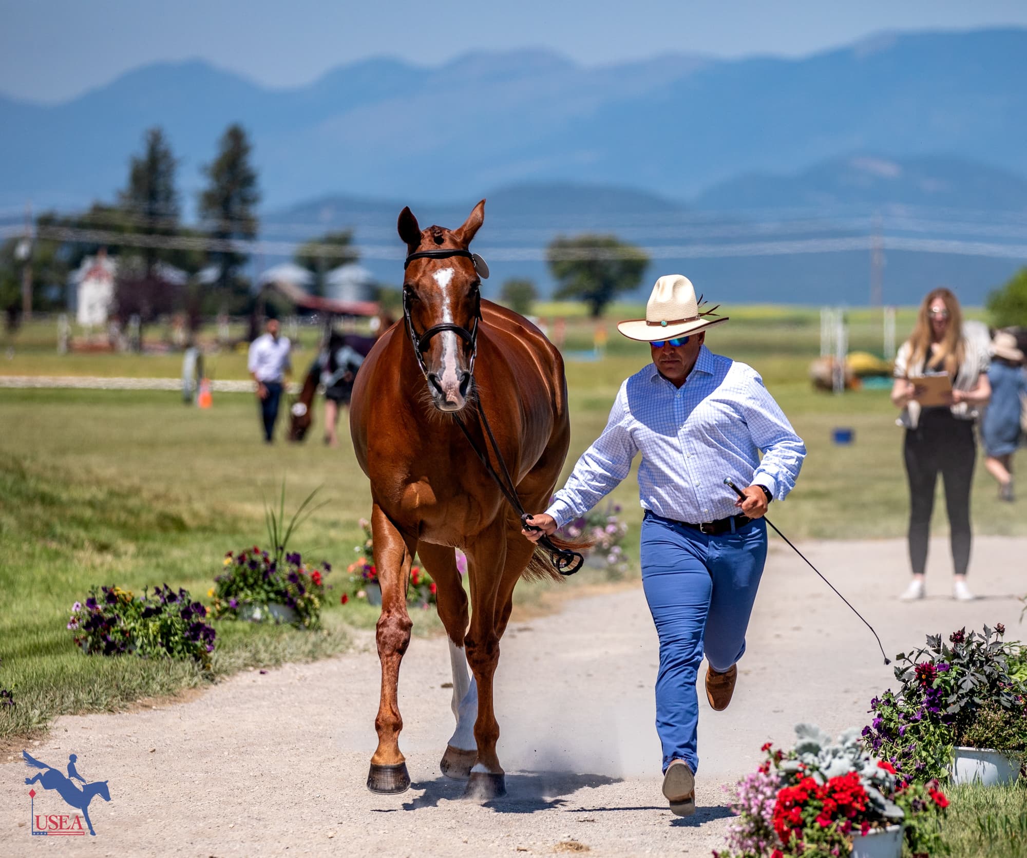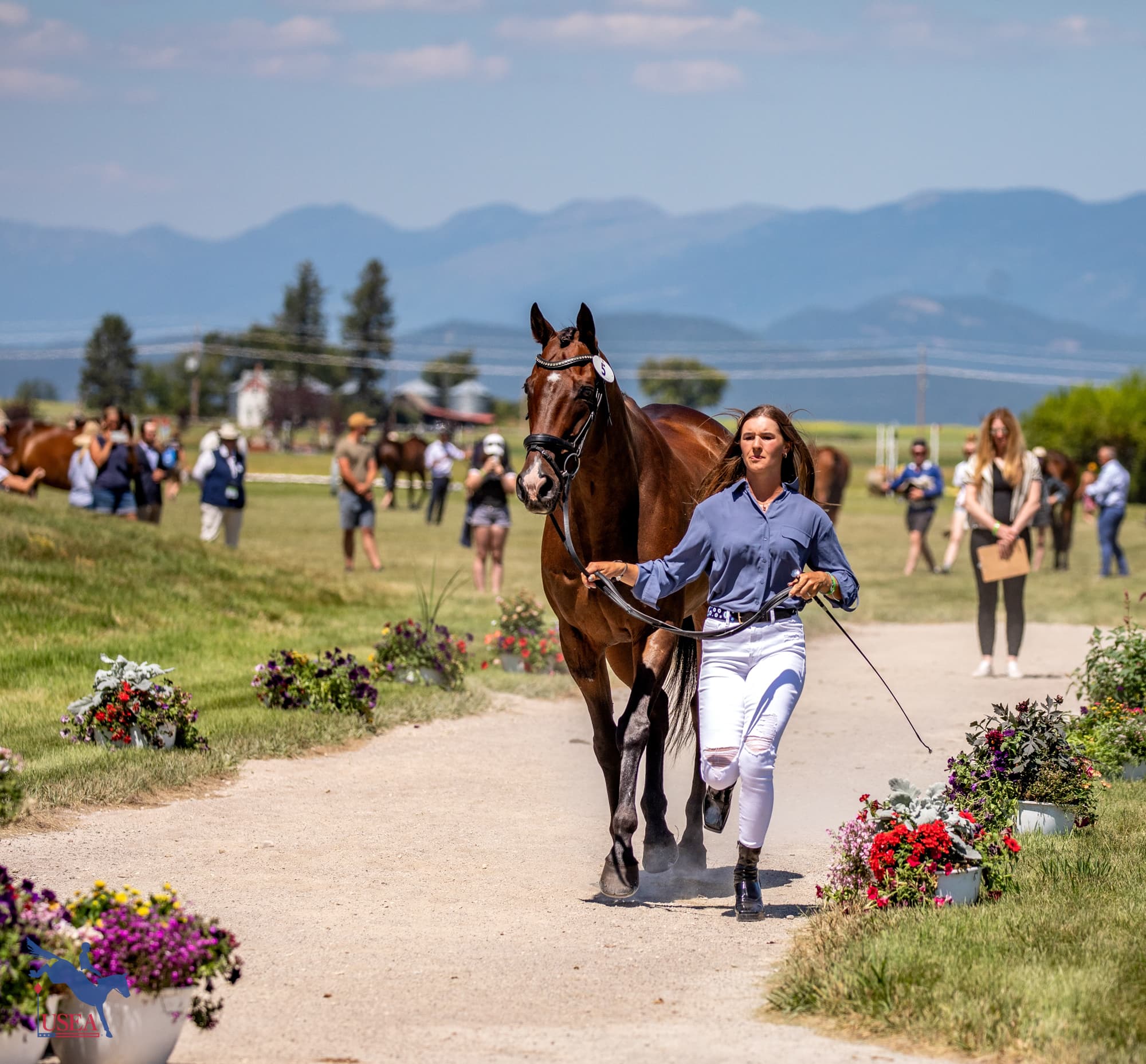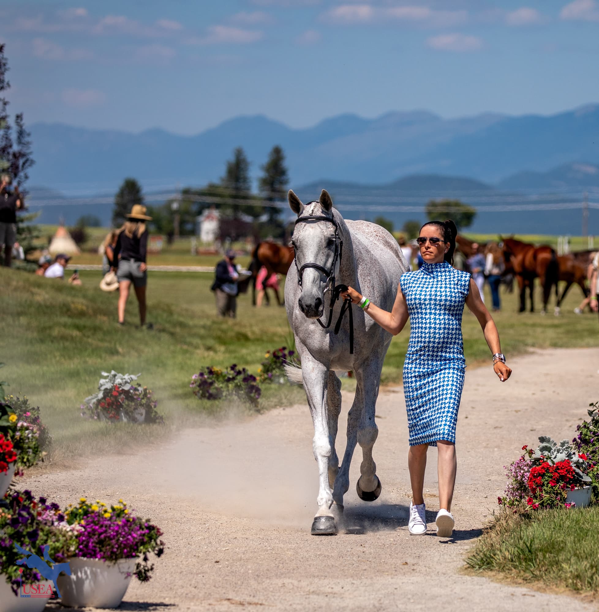 With trips to the event covering upward of 2,500 miles for few, there’s bound to be some shaking loose and kicking up dust, happy to have arrived under the big sky. The most animated steeds were both gray Thoroughbred geldings—Argyle, owned and handled by Skyeler Voss, and Vincent Chase, owned and handled by Heather Gillette—who floated forward, a bit sideways at times, and ears perked on the cross-country field beyond the potted flowers.