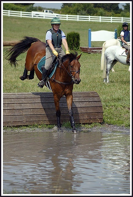 Fast forward to this spring and after a terrific clinic down in North Carolina at the Carolina Horse Park with Lucinda Green, we had our debut at preliminary at Sporting Days Horse Trials in February 9th. Dressage was surprisingly very very good with us being in first place with a 28.9. WOW!! I couldn’t believe it! On to show jumping and I pulled one rail, entirely my fault, picked picked to the base–oh well!! Then we went out and ate up the cross-country course, it had all the questions, just not too big!! Corners, bounce, water, coffin and some great galloping fences – we had some time but I was thrilled and we ended up 6th overall!! Not to bad for my little homebred pony!!
