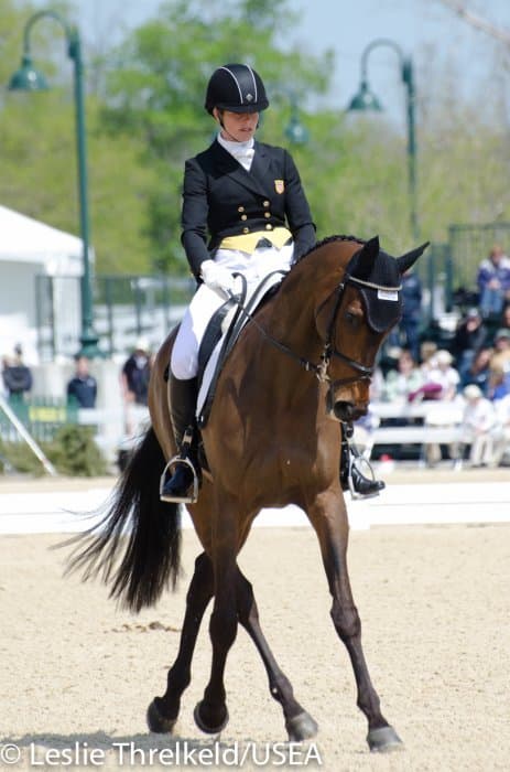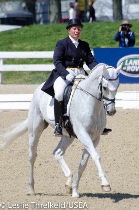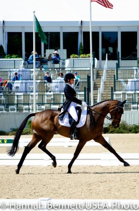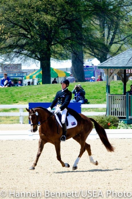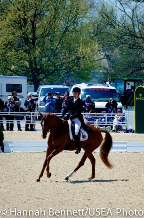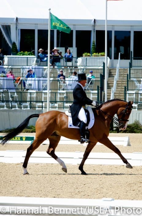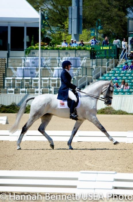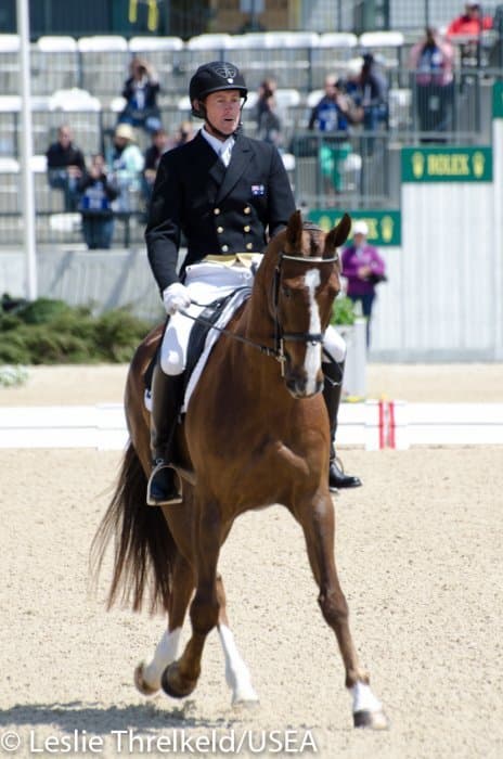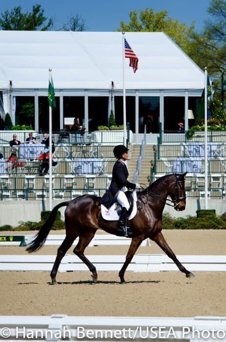 An eruption of applause from the stands congratulated Becky Holder (USA) and Can’t Fire Me after their lovely, relaxed performance that put them in second place with a 44.2. Though “Teddy’s” look and movement brings back memories of Becky’s famous former partner, Courageous Comet, Becky said the only thing they have in common is color. “Comet is a ham and loves attention. The bigger the crowd is the easier he is to ride. Teddy would be happy to be sweating away by himself with no one in sight and always give it 110 percent,” Becky said.
