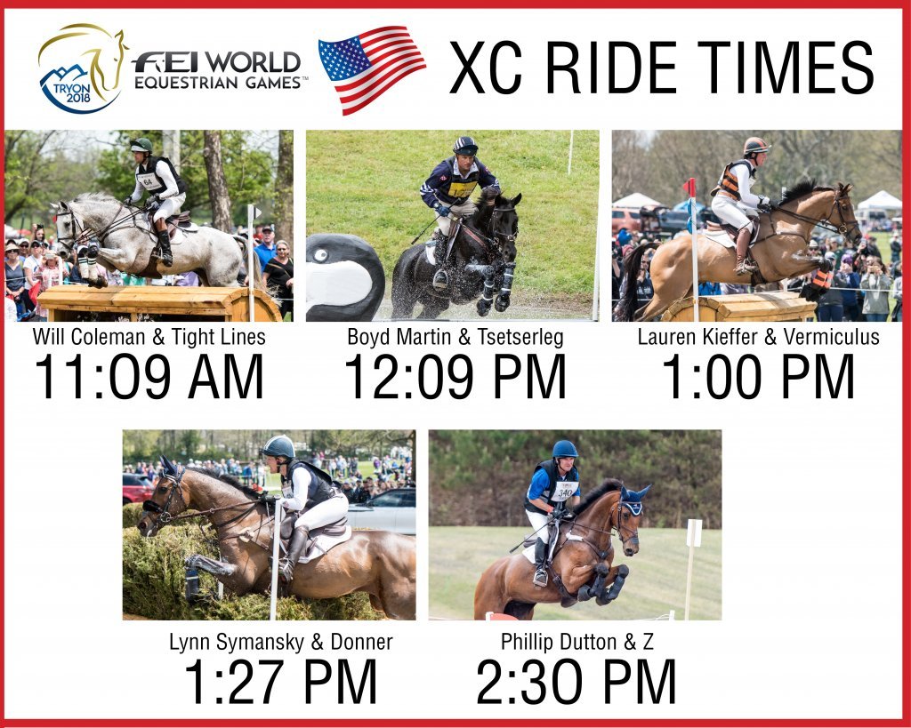 The FEI released a statement last night stating that, while cross-country would still begin at 11:00 a.m., the interval between riders has been decreased from four minutes to three minutes. The distance of the course remains at 5,700 meters but modifications have been made to two fences, 23A and 23B. The first rider will leave the start box as 11:00 a.m. and the last rider goes out at 3:03 p.m. U.S. Team ride times are below. Click here for complete ride times.