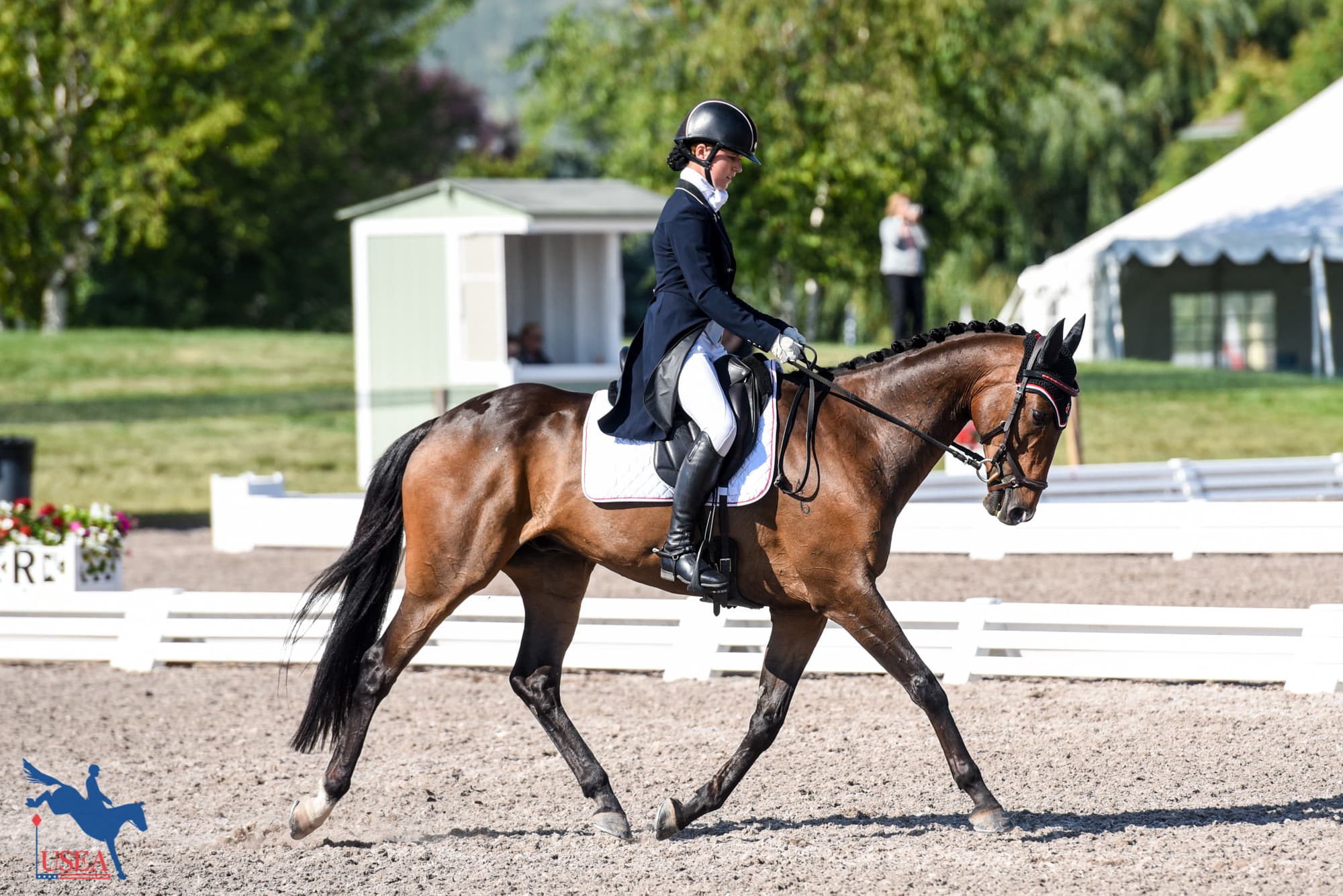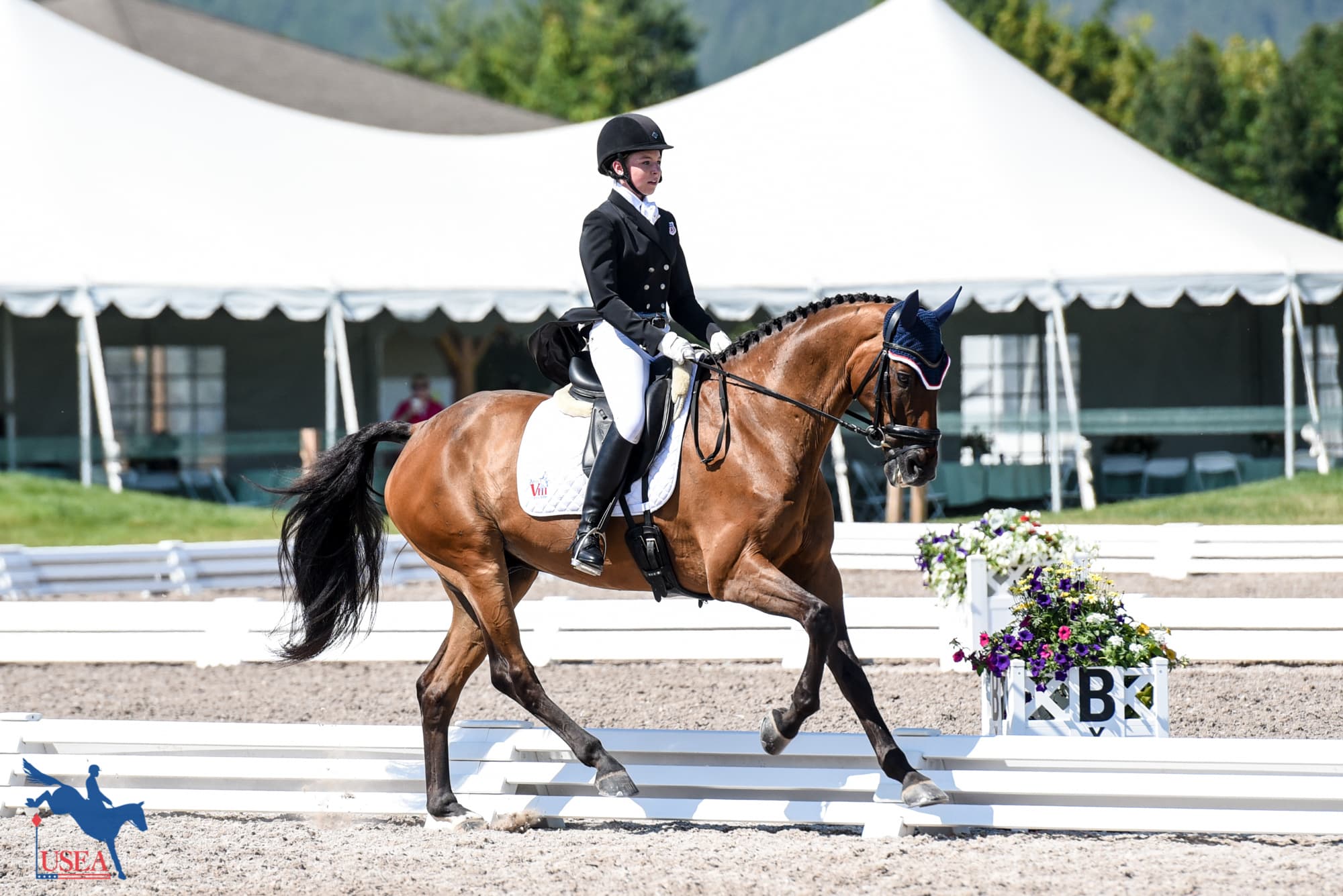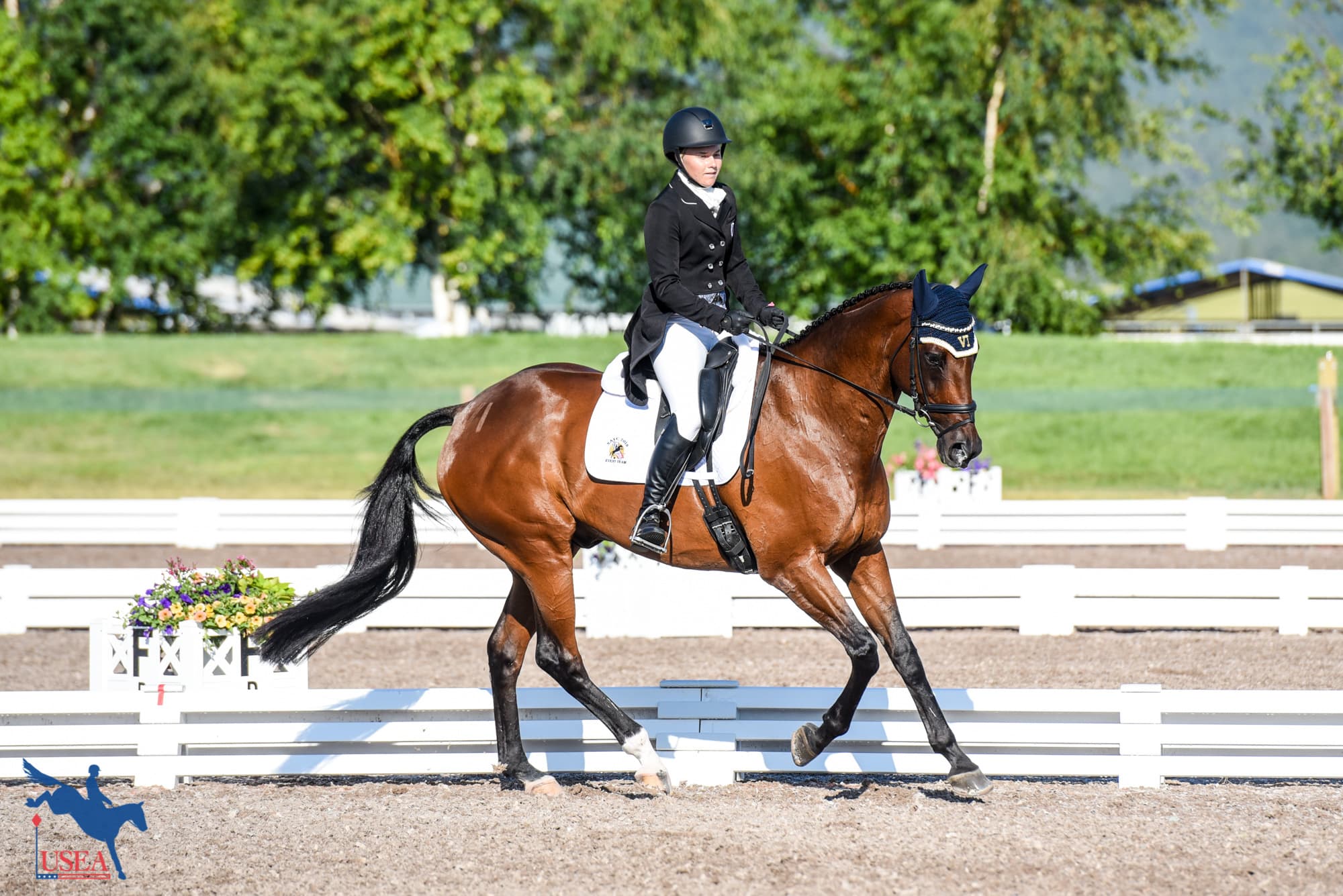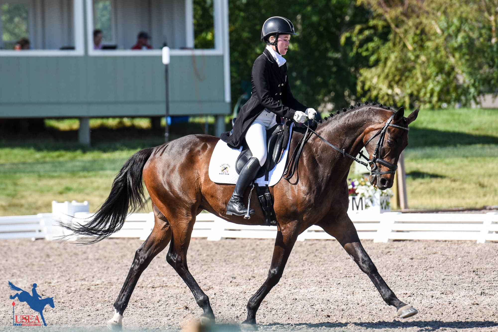It’s certainly not the worst to go first. Area VIII’s Alexandra Baugh took one for the team and trotted down the center line as the first competitor of the day, and the judges were undoubtedly impressed with the 2017 NAYC CH-J* individual silver medal pair. Ballingowan Pizazz (OBOS Quality x Rocklea), Altorac Farm’s 16-year-old Irish Sport Horse gelding had an smooth test with Baugh in the irons, scoring a 30.8 which remained the best score of the day to sit in individual first place heading into the next phase. “Mango was absolutely perfect,” said Baugh who is riding for the combined team of I/IV/VIII. “It was definitely one of our best tests to date. It’s been a bit of a challenge for us, and I’ve had him for two years now. We’ve finally gotten to know each other more and we’ve figured it out. He was really great today.”