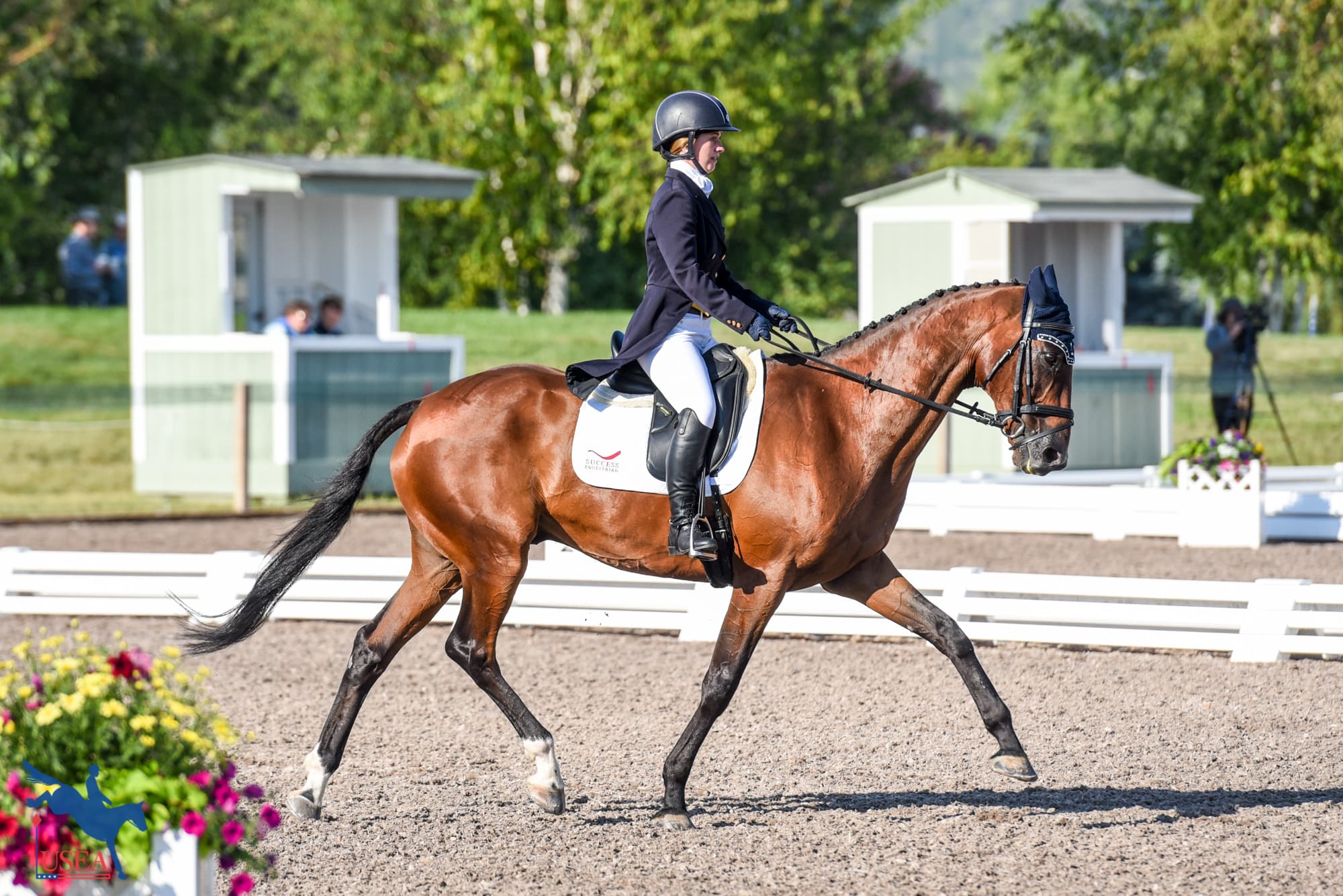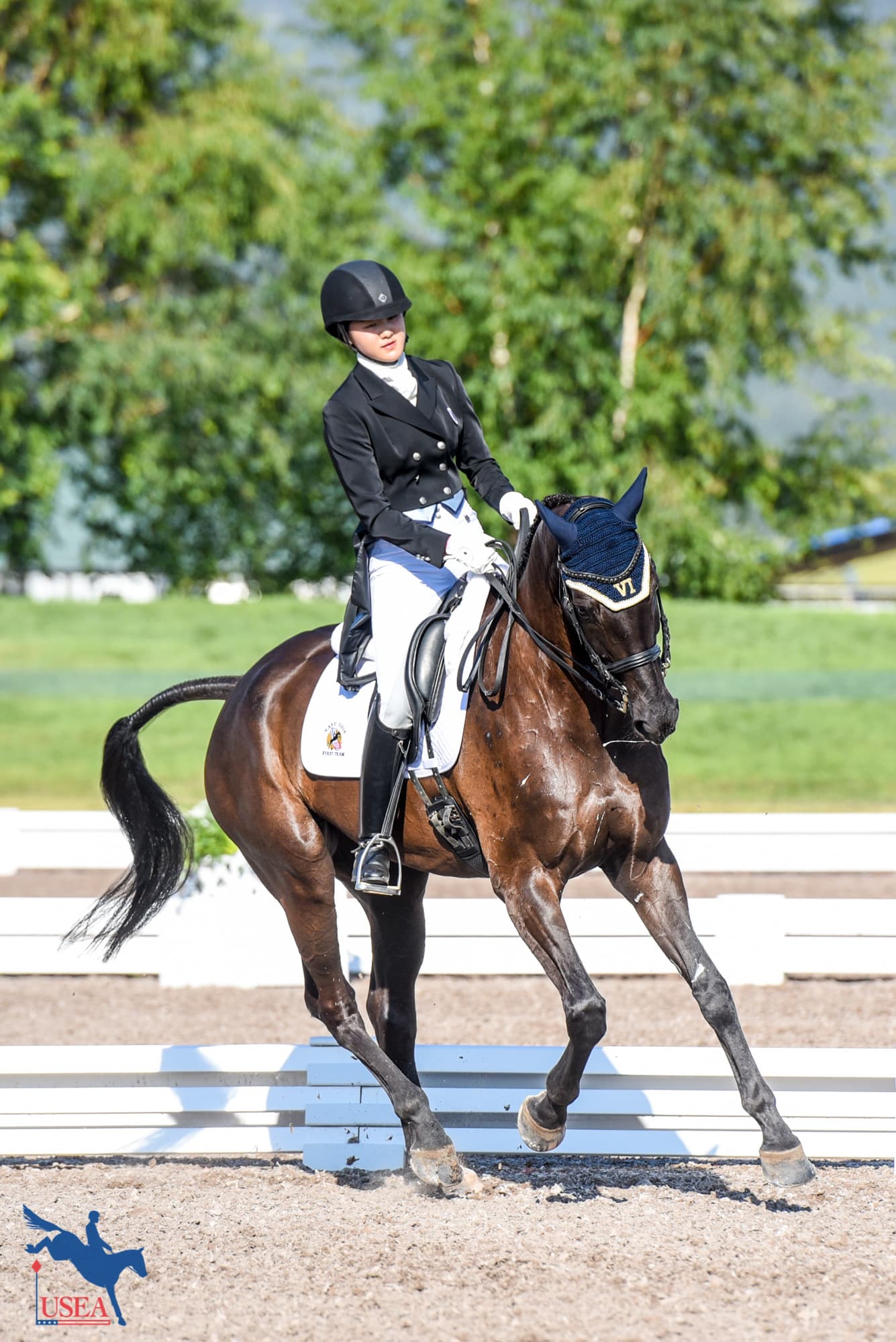 Tayler Stewart and her own 15-year-old Westphalian gelding, Ideal Contini (Contini x Riviera Wonder) lead the way for Area II on a 31.2 and sit in individual second place. “I was really thrilled with our test especially after I saw the score,” said Stewart with a smile. “I never know quite what I’m going to get going into the ring. I can either get a good, or a not so good score, but I prepared the best I could for this test. Coming into [the NAYC], I wanted to be as confident as I could, and he was really steady and game for his test, so I’m really proud of him.”