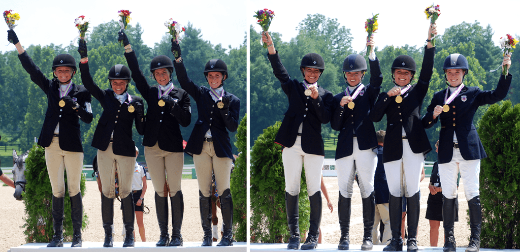 The four Texans from Area V led wire to wire in the CH-J* at this year’s Adequan/FEI North American Junior and Young Rider Championships. The Team finished on a score of 184.4 a 20 point margin over second placed Area VI. Area V Team member, Alyssa Phillips, also claimed the individual gold medal with her horse, Sundance Bay. The Bronze medal went to Team Ontario and team members Sable Giesler and Brook Pickering medalled individually with silver and bronze as well. In the CH-Y** it was a tight race in the Team competition, but Area III came out victorious with Area V/IX settling for silver and Team Canada taking bronze. Individually Devon Brown and Dynamic Image (Area III) earned the gold medal with Jacob Fletcher (Area V) and Sarah Kamensky (Area II) taking silver and bronze. (Pictured Above Left: Area V CH-J* Gold Medal Team; Pictured Above Right: Area III CH-Y** Gold Medal Team.)