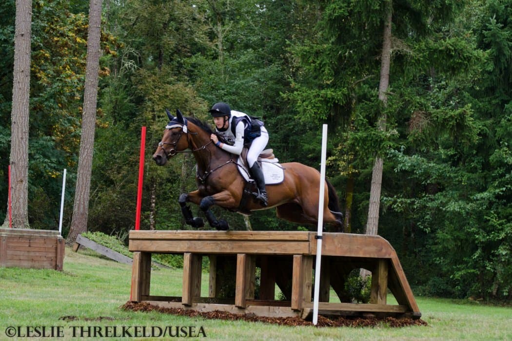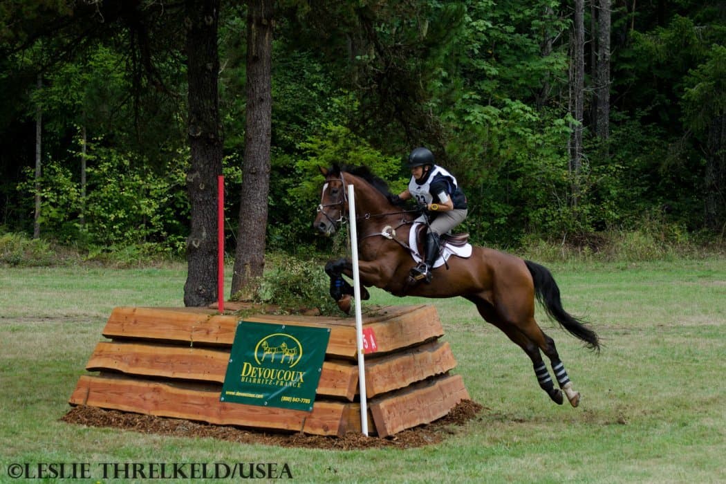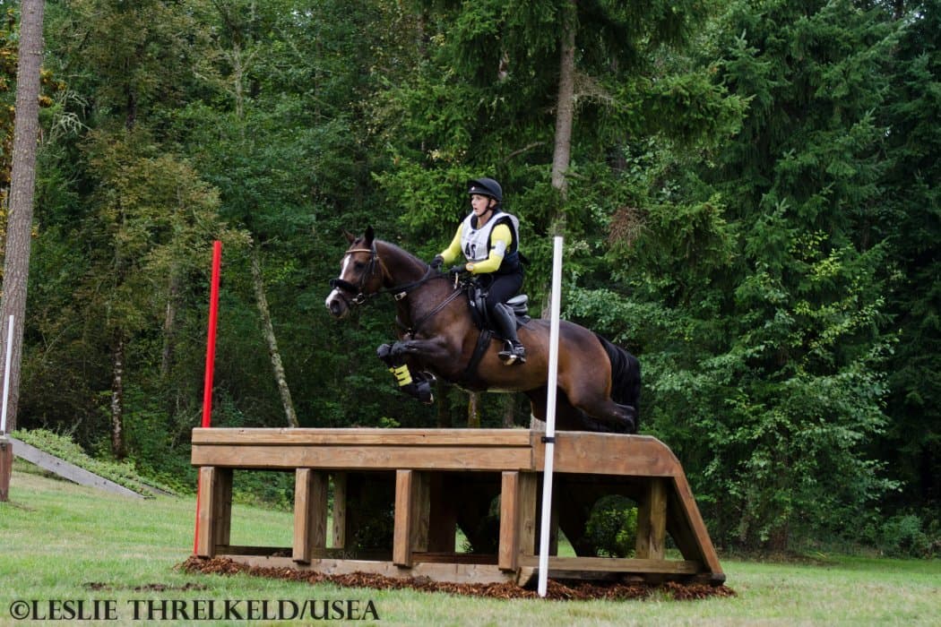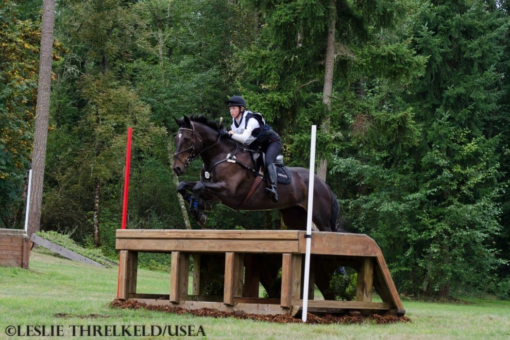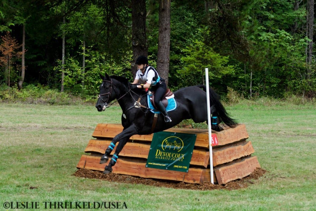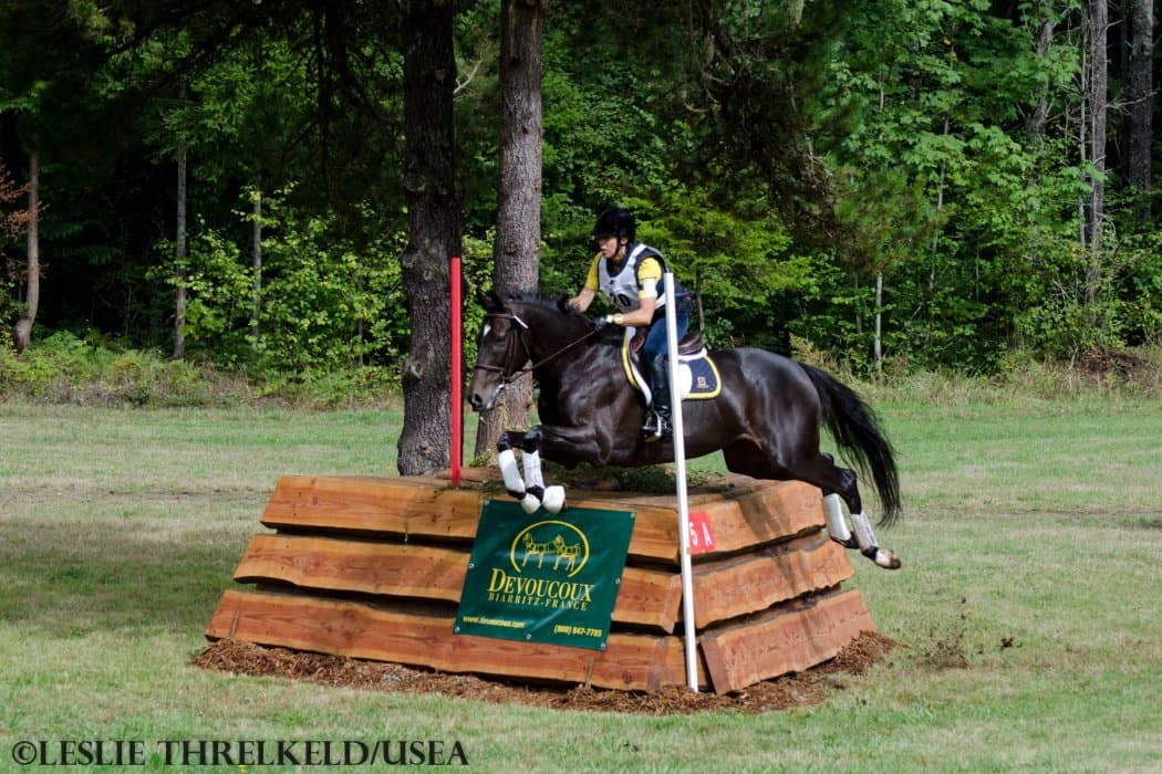 The Natural Migrations Intermediate Championships proved to be a true test of skill, with eight of 15 starters completing the event. Additionally, only six navigated the undulating cross-country without jumping errors. The first several competitors to leave the start box were eliminated or retired by fence 10ab, a tricky narrow brush to a cabin; everyone breathed a sigh of relief when Leila Lucas and Othello became the first to cross the finish line. Maya Black, of Clinton, Washington, won the dressage phase with Doesn’t Play Fair, so she wore an orange pinney on cross-country to indicate her lead, as did every other division leader in the event. She and Dawn Dofelmier’s 7-year-old Holsteiner gelding ultimately became the only pair in the division to finish on their dressage score.