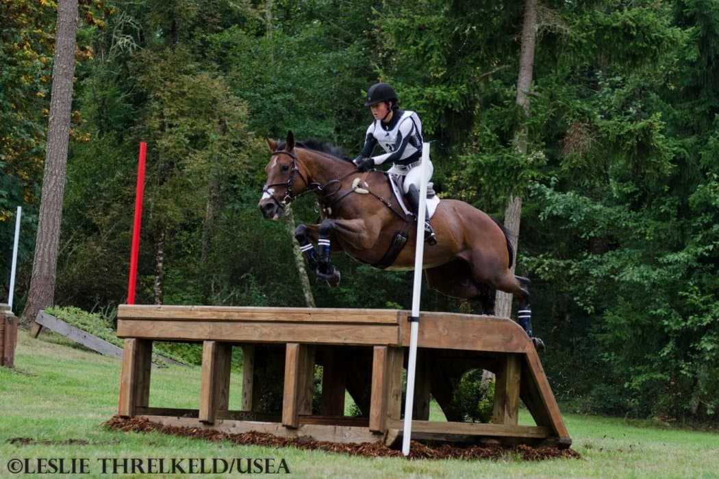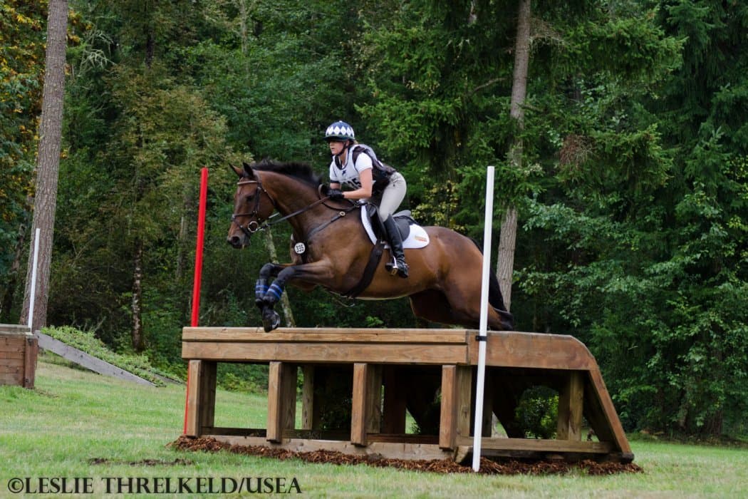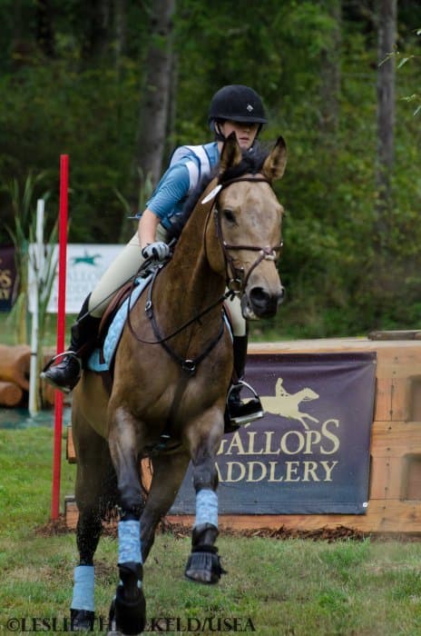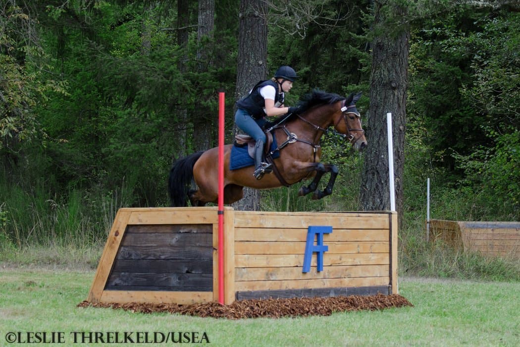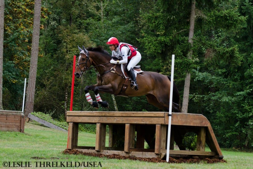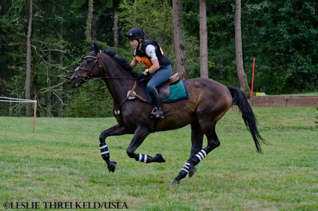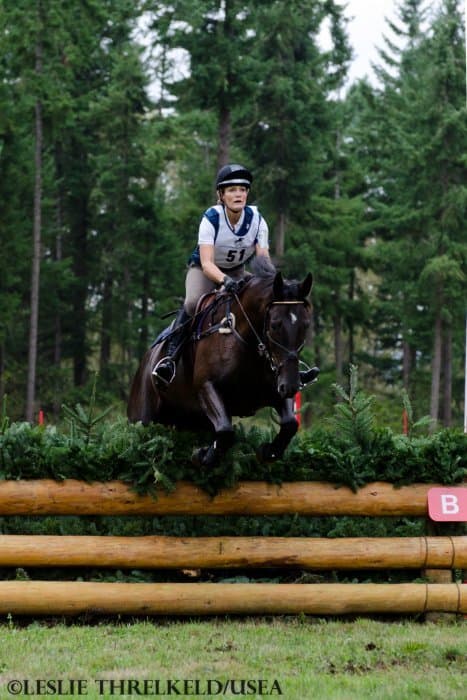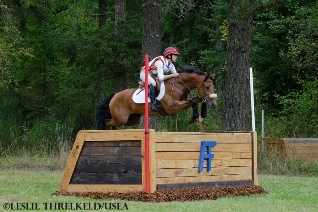 The Natural Migrations Intermediate Championships proved to be a true test of skill, with eight of 15 starters completing the event. Additionally, only six navigated the undulating cross-country without jumping errors. The first several competitors to leave the start box were eliminated or retired by fence 10ab, a tricky narrow brush to a cabin; everyone breathed a sigh of relief when Leila Lucas and Othello became the first to cross the finish line. Maya Black, of Clinton, Washington, won the dressage phase with Doesn’t Play Fair, so she wore an orange pinney on cross-country to indicate her lead, as did every other division leader in the event. She and Dawn Dofelmier’s 7-year-old Holsteiner gelding ultimately became the only pair in the division to finish on their dressage score.