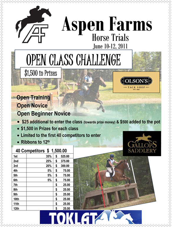 Aspen Farms in Yelm, Washington are hosting and Open Class Challenge with $1,500 in prizes during their June 10-12 Horse Trials. The levels offered are: Open Training, Open Novice, and Open Beginner Novice. It is limited to the first 40 competitors to enter and it costs an addition $25 which goes to the prize money. In addition to the $1,500 in prizes there will also be ribbons through 12th place.