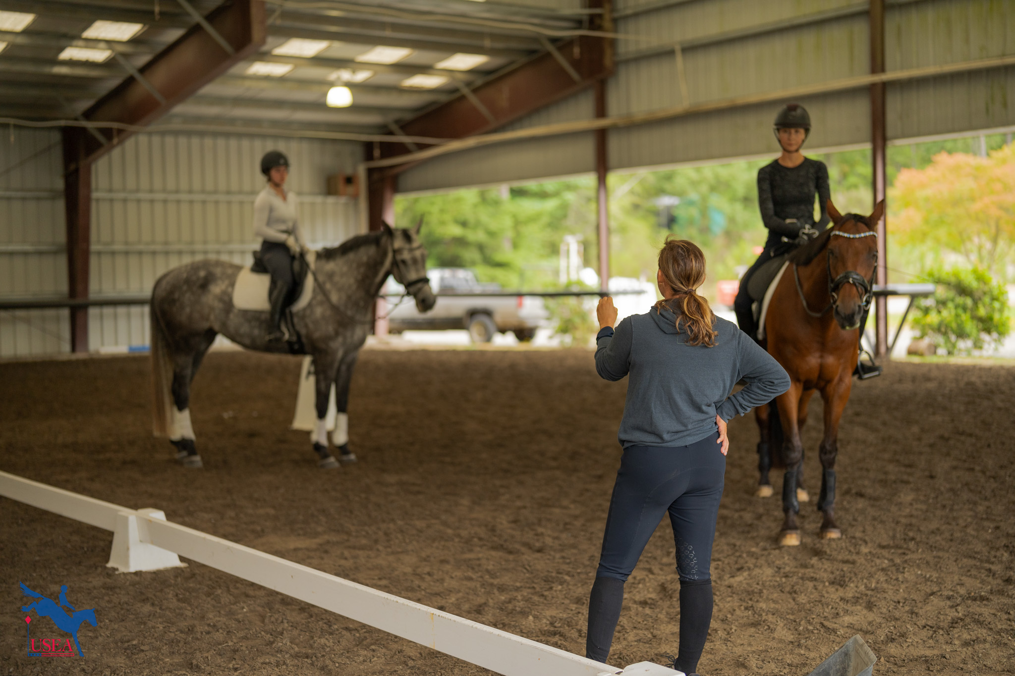 Next up were Kaylee Petticord, 19, of Enumclaw, Washington, and Ella Eisenbarth, 17, of Woodinville, Washington. Both ride at the Preliminary level with their horses. While the two warmed up their respective mounts, Brown talked with the participants who were watching from the ground about the importance of catch riding. At her Texas training operation, RB Riding, she’s instituted “Catch Ride December” where she encourages all of her students to ride as many other horses as they can. She emphasized how important it is for EA21 participants, too.