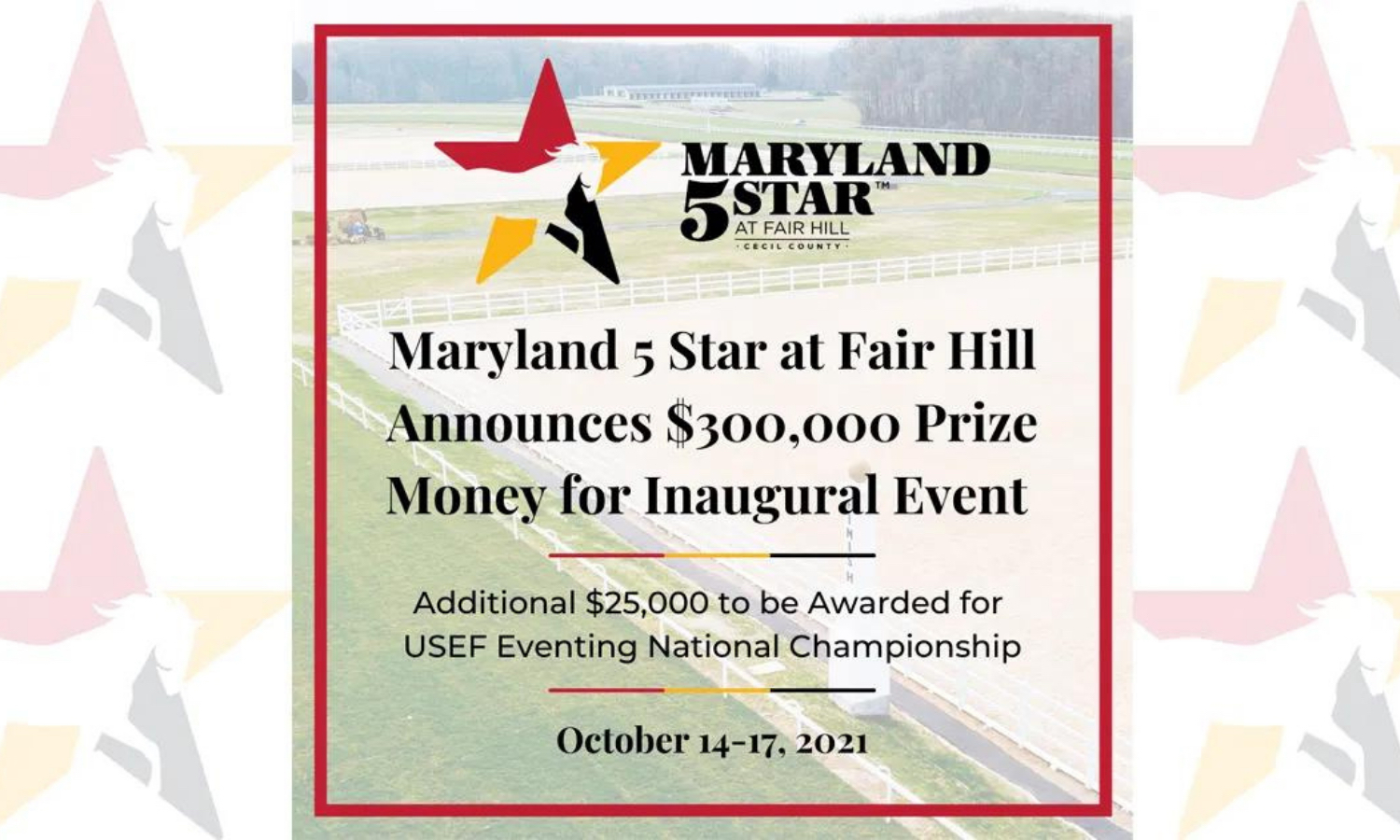 The Fair Hill Organizing Committee (FHOC), an affiliate of the Sport and Entertainment Corporation of Maryland (The Sport Corp.), today announced athletes and horses in the inaugural Maryland 5 Star at Fair Hill (CCI5*-L) will be competing for $300,000 in prize money. Additionally, the US Equestr...