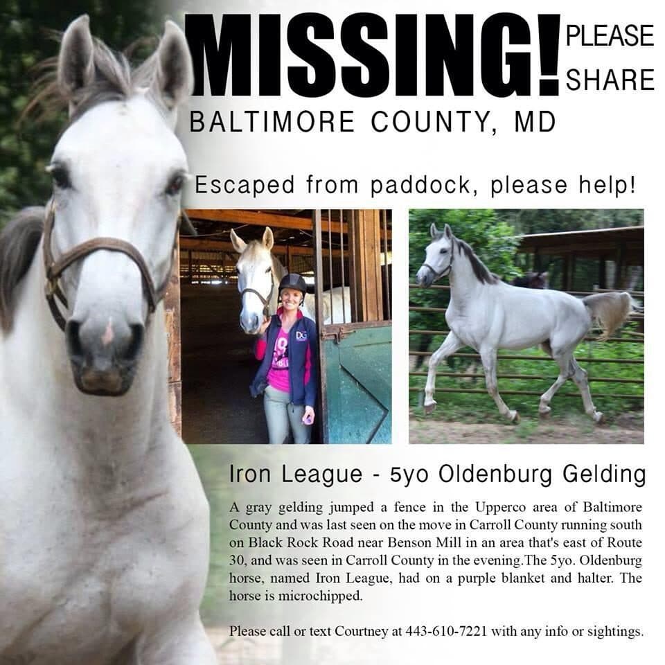 Upperco, Md. – Monday morning February 9th, a horse is still missing after he jumped a fence at a Baltimore County horse farm near the Carroll County line on Black Rock Road. Owner Juliana Whittenburg had just sent the 5-year-old grey Dutch Warmblood gelding, named Iron League from Florida to Maryland for training at An Otherwise Perfect Farm with Courtney Sendak.