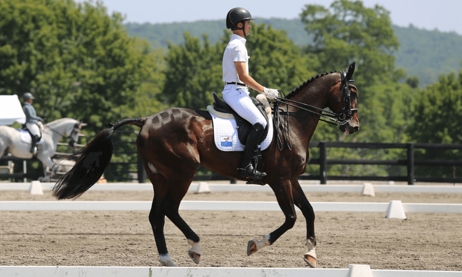 Millbrook, N.Y. - July 28 - The Millbrook Horse Trials, held July 27-30 in Dutchess County, New York, wrapped up the first two days of competition today, with the upper levels taking to the dressage phase at Riga Meadow at Coole Park Farm, and the lower levels heading out on the cross-country course across the road.