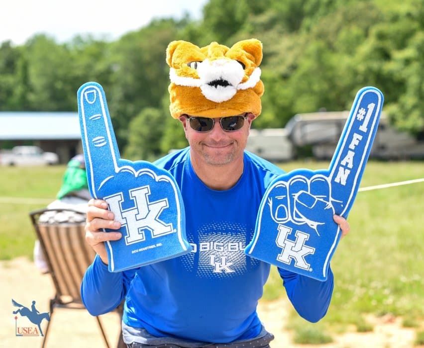 Expressive helmet covers, bold flags, bright banners, matching quarter marks, school mascots, decorated jean overalls, and more: school pride was apparent in the ‘College Town’ at the Intercollegiate Championship. Auburn University (AU) had five riders, University of Kentucky (UK) had two riders, University of Virginia (UVA) had two riders, and Clemson University, University of Tennessee, Knoxville (UTK), Texas Christian University (TCU), Randolph Macon College (RMC), University of South Carolina, Aiken (USC Aiken) all had one rider compete on the first day.