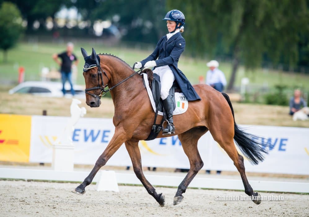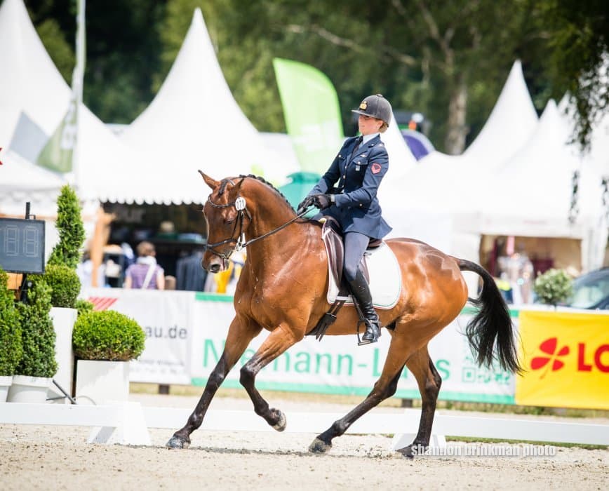 Closely behind Julia is team colleague Josefa Sommer (GER), who could not be happier with her gelding ‘Hannes’ today. “He has improved from test to test this year and today he really gave it his all. The canter work still needs a little work but I really could not have asked for more. Even our changes were pretty good today, which I managed to improve after getting some useful tips from Ingrid Klimke.“