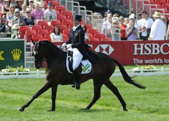 Piggy French (GBR), second, had the distinction of scoring the only 10 of the competition, awarded by Ground Jury President Anne-Mette Binder (DEN) for her halt on Jakata, and it was greeted by a deafening roar of approval from the packed stands.