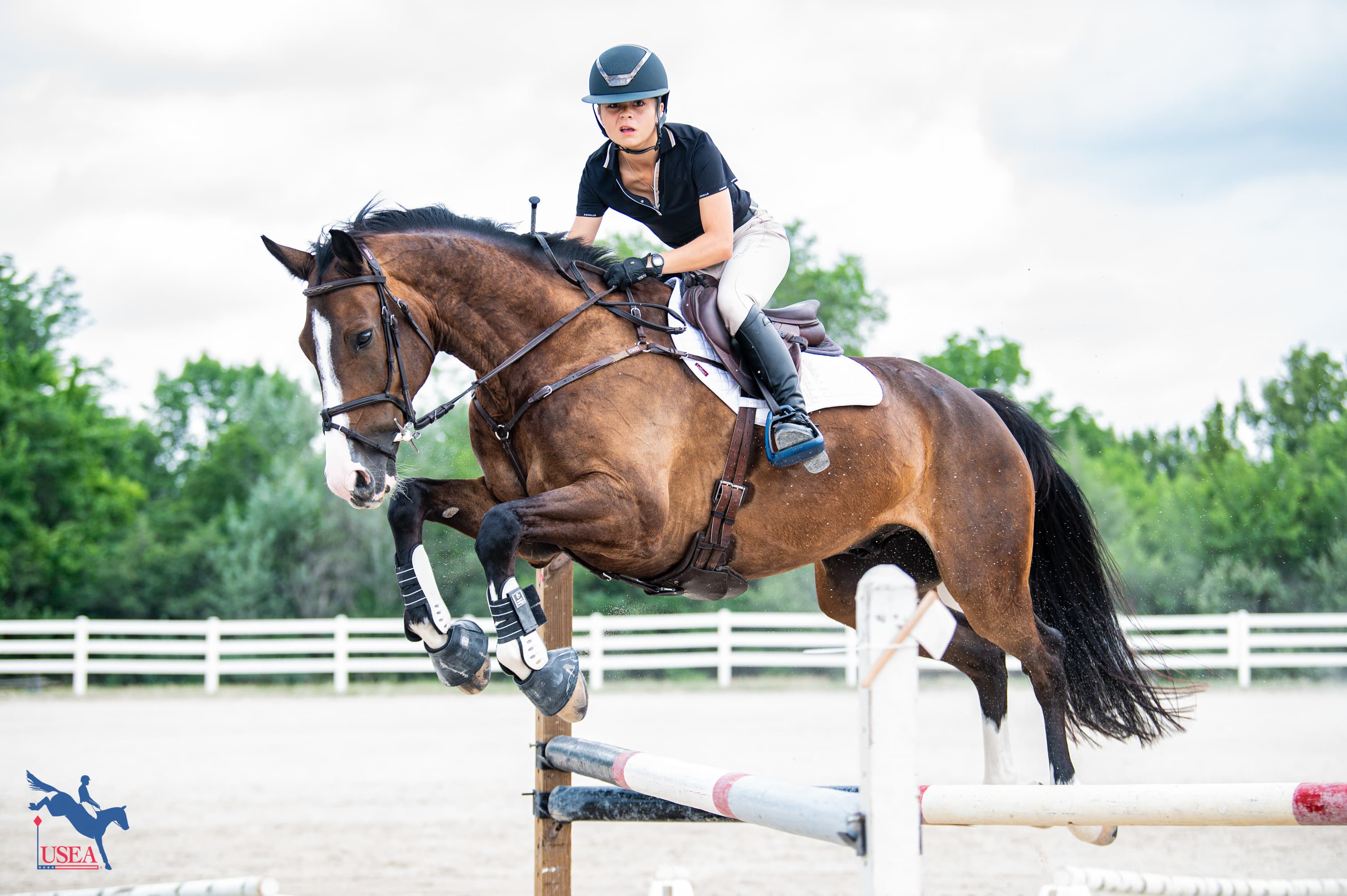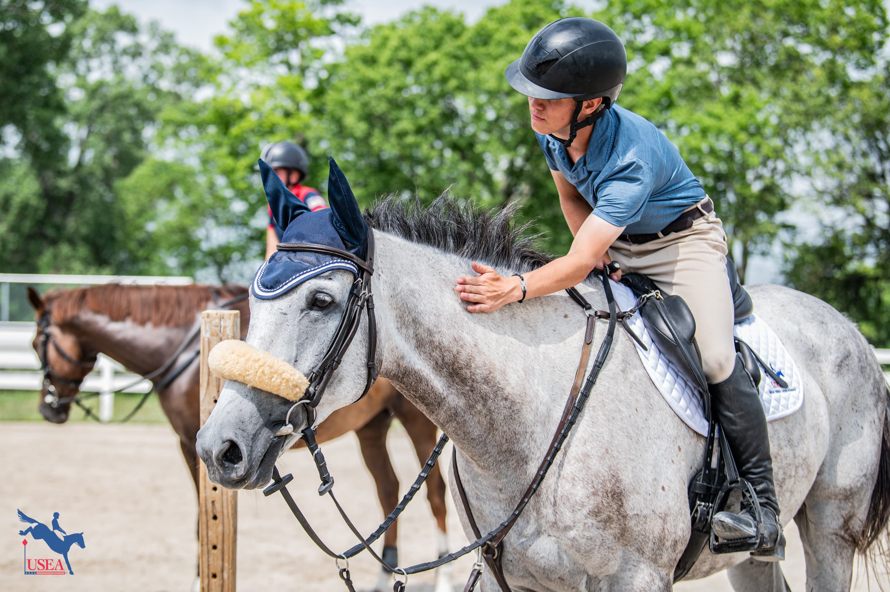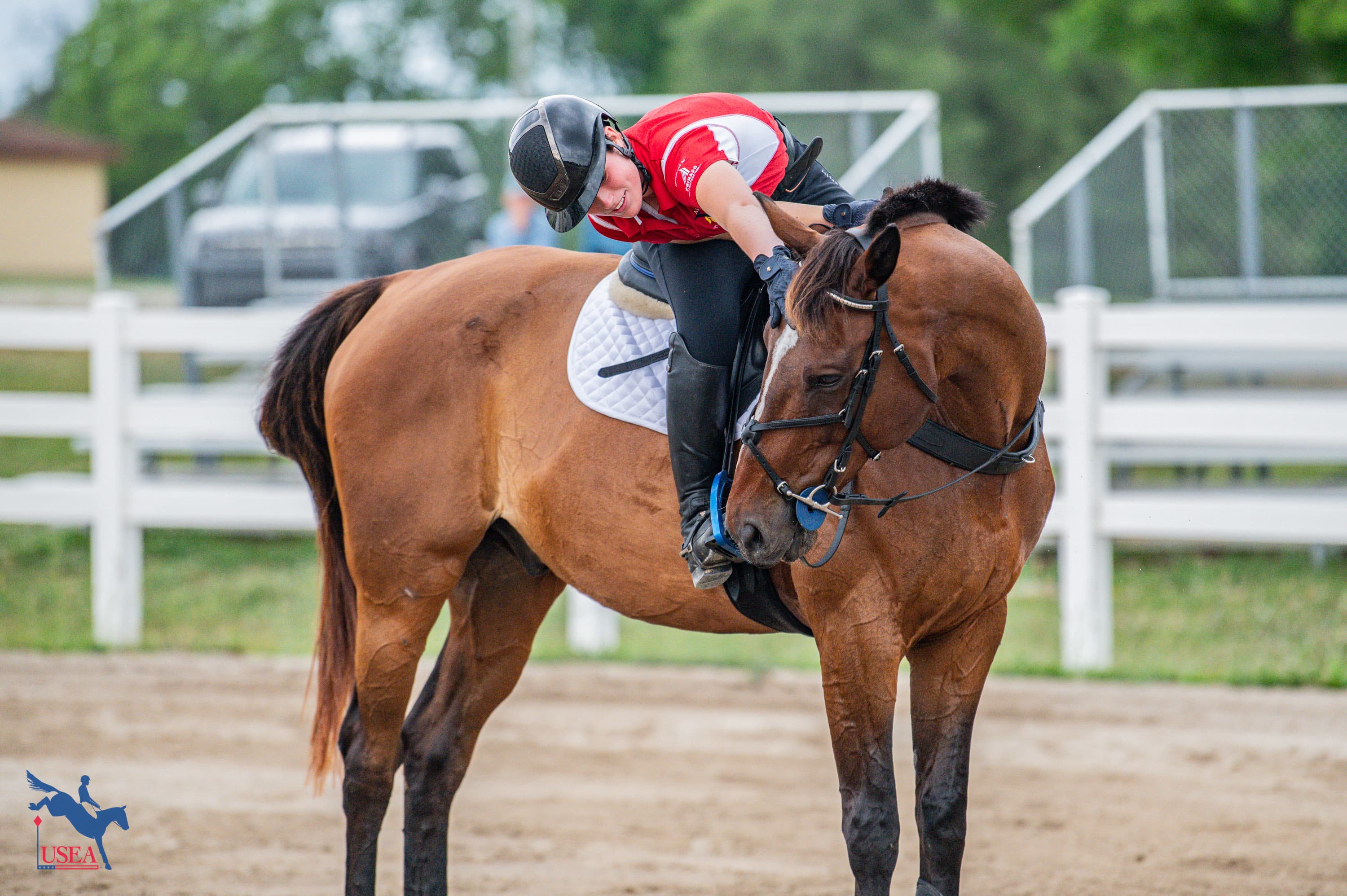 “I asked the clinic coordinator if she knew anyone who might have a horse I could use, but when that didn’t lead to anything I knew I wasn’t going to give up there!” said Peinado. She put a callout on Facebook hoping to connect with someone local to the area and was quickly connected with Mallory Stiver of Stilwell, Kansas, who generously allowed Peinado the use of her 14-year-old Thoroughbred gelding Hugo Boss (Artax x Goodie Good Girl), or “Huey.”
