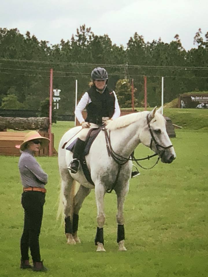 Kim Severson passing along some pointers to Martha Woodham on Saxon. Photo courtesy of the Area III Adult Riders Facebook page.