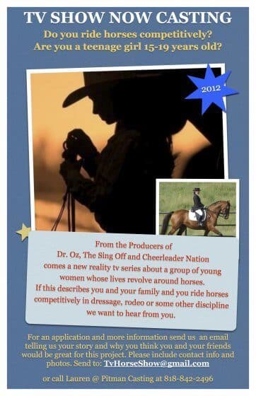 Pitman Casting in Los Angeles, California are currently working on a docu-reality series that focuses on the highly hectic yet rewarding lives of high school girls who compete in competitive horse riding sports. The producers who brought Sing-Off and Cheerleader Nation are searching for candidates for this brand new docu-reality series. They are looking for outgoing, competitive, fun-loving girls between the ages of 15-19 that are passionate about the sport and are able to give a glimpse into the real life of a competitive rider.