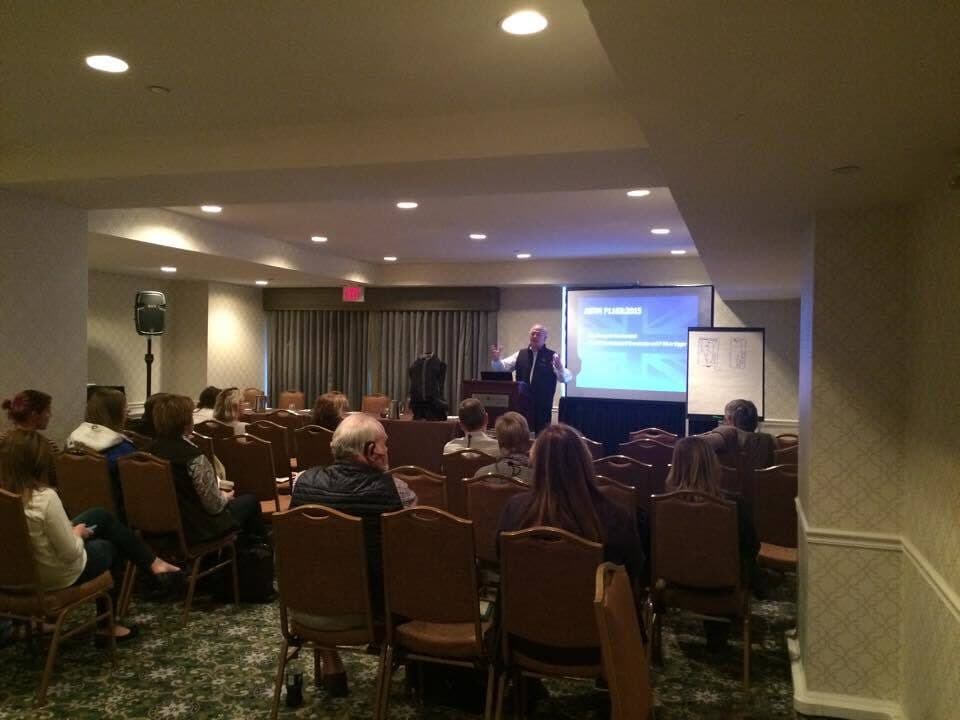 Roy Burek visited our Annual Meeting to share some of the most cutting edge innovations in safety for equestrians. He began by explaining how helmet testing has existed historically. Manufactures have previously tested helmets in a direct fall scenario as if the rider were to hit the ground at a 90-degree angle. The reality is that most falls see impact in uncharacteristic ways. Burek showed an animation of this fall, which helped visualize the amount of movement that occurs inside a helmet when a normal fall like this takes place. Even with this amount of movement within the helmet, the outside may still appear unscathed. Because of this, Burek cautioned that helmets should be replaced after any fall, even if the helmet does not appear to be damaged, because inside layers could be compromised.