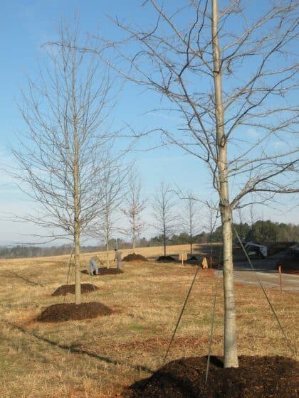 "The trees are fairly mature - about ten meters tall. We have several different varieties of oak, maple, elm, and poplar trees," said Ritch Temple, course designer of Chattahoochee Hills and AEC organizer. The trees were "rescued" from a tree farm about 100 miles from Chatt Hills--a bank had bought the property and the future of the trees was bleak.