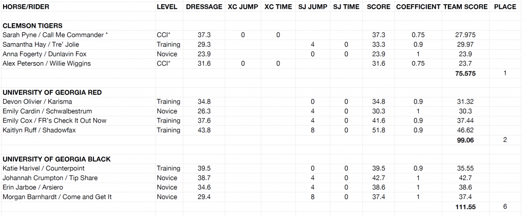 The University of Georgia Bulldogs follow behind Clemson in second place with a total score of 99.06. This red and black team consists of Seniors Devon Olivier, Kaitlyn Ruff and Emily Cox as well as Sophomore member Emily Cardin. Rounding out the top three and riding for Auburn University, Lydia Kennedy, Andrew Glazer, Sallie Johnson and Kaley Bush currently hold third place.