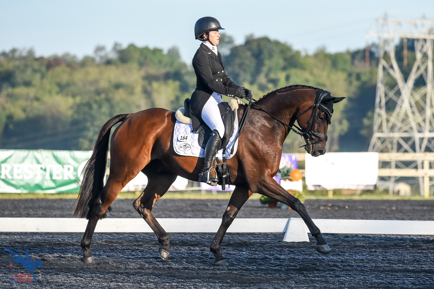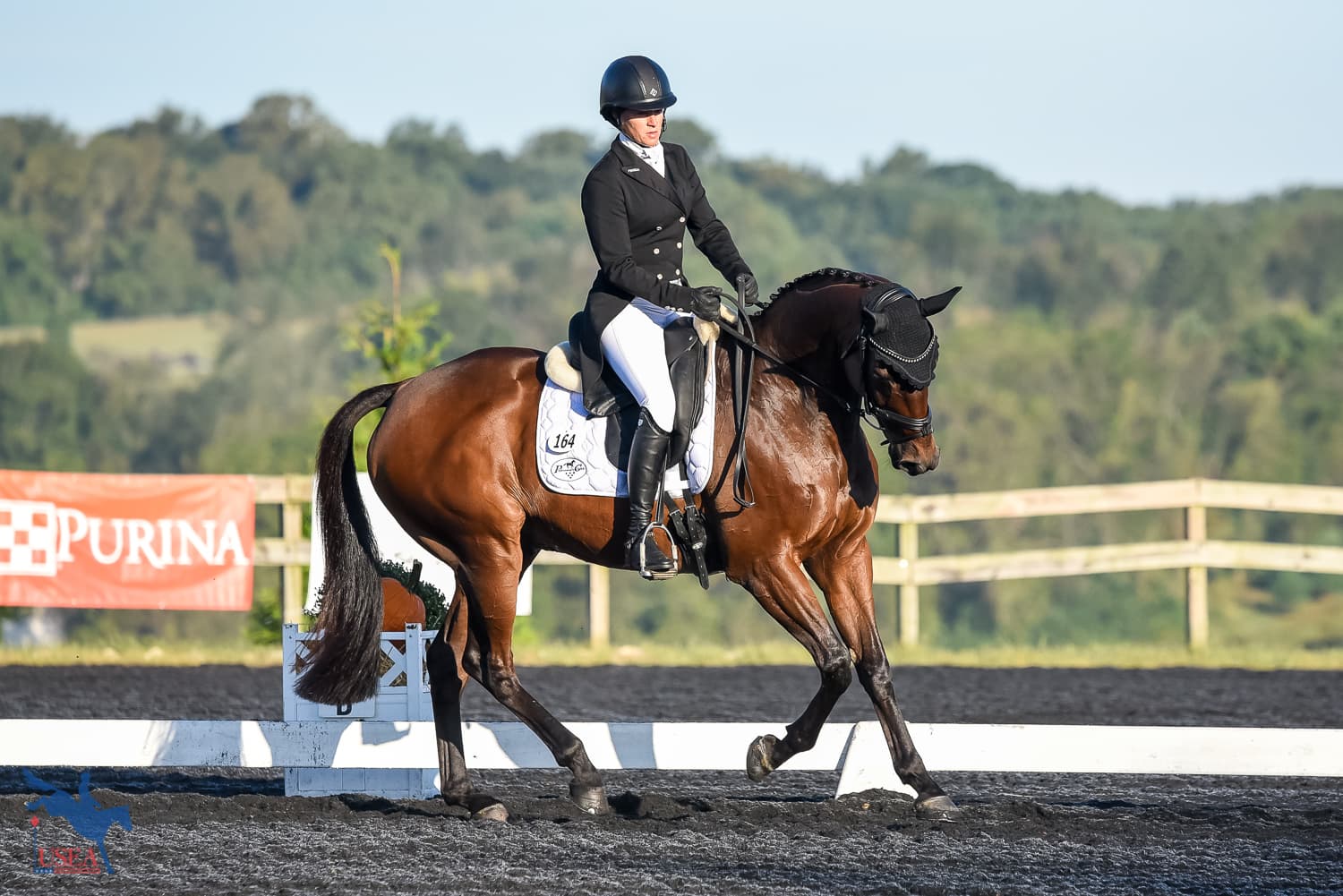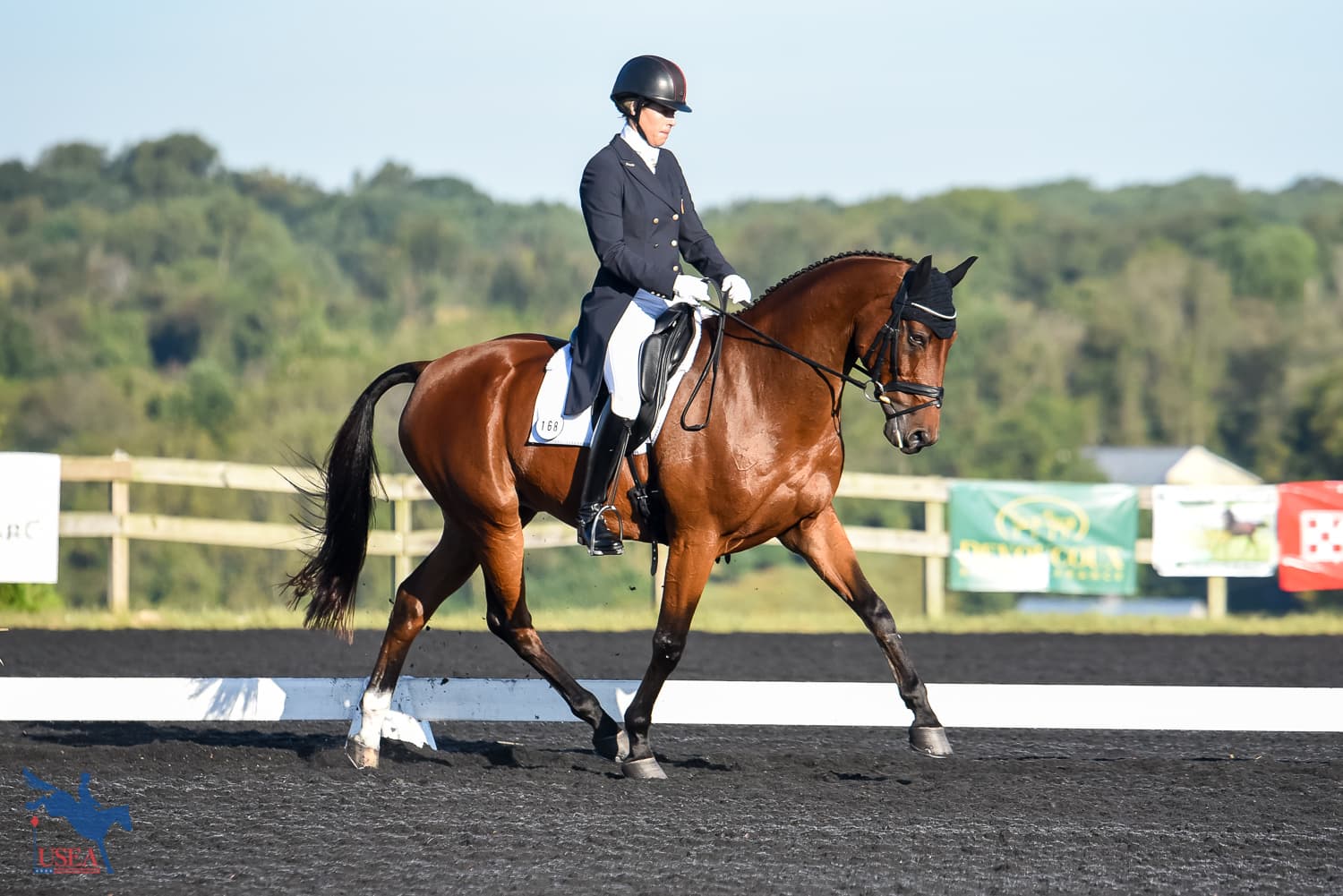 “I’m really pleased with him today,” she continued. “Even with a couple of little hiccups that we had in warmup, I’ve been working on just getting him a little bit more consistent, a little bit more through, and then I’ve been working on trying to ride a clean test. I was pleased because I felt like we had a lot more of that today . . . I’m glad that I at least did a clean test this time where a couple of weeks ago [at Great Meadow] I had a couple of bobbles here and there.”