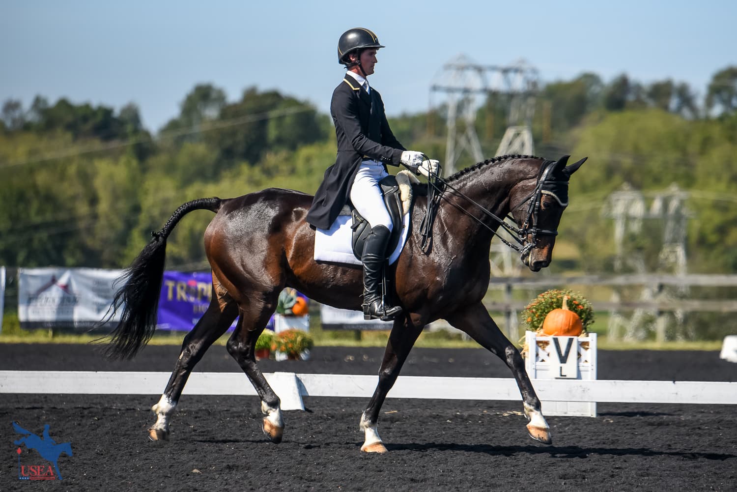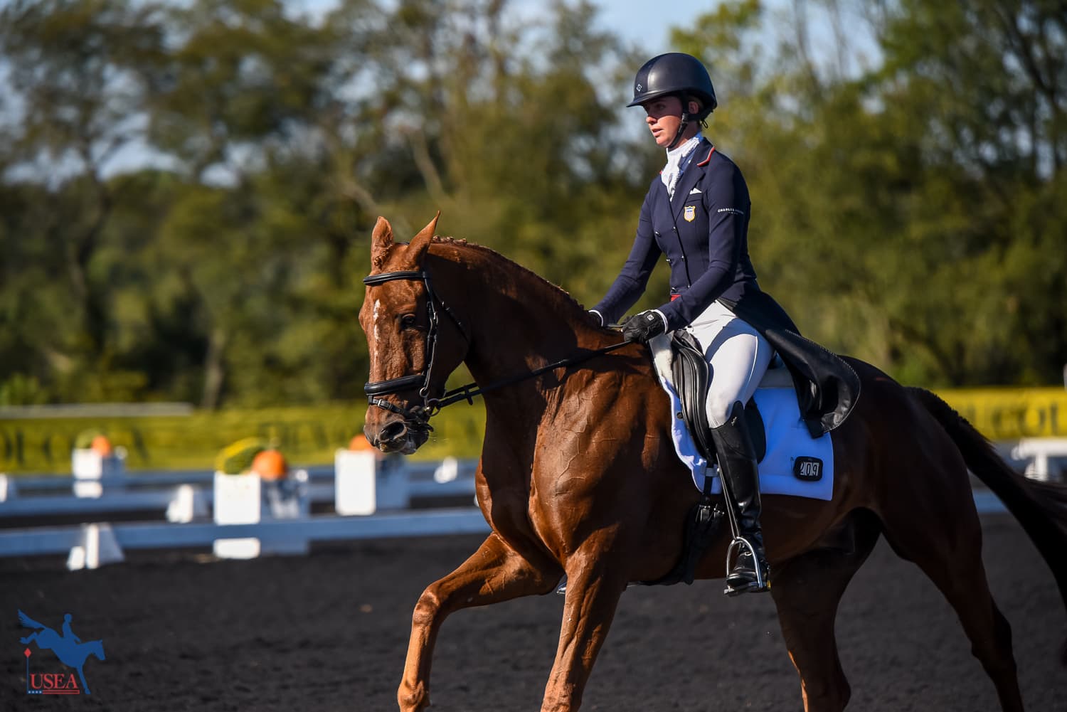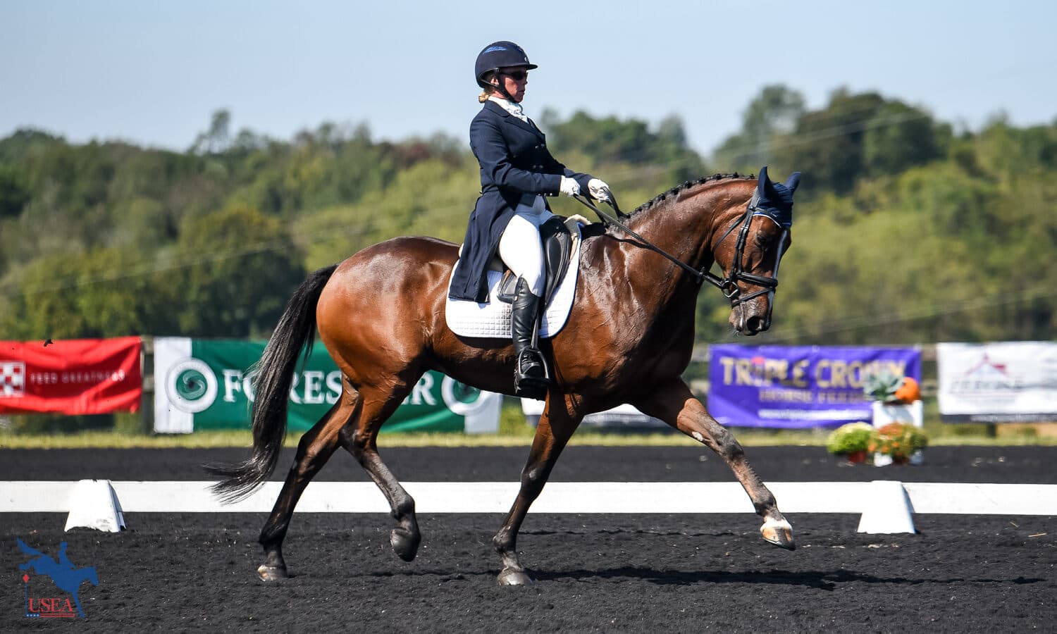 “I’m really pleased with him today,” she continued. “Even with a couple of little hiccups that we had in warmup, I’ve been working on just getting him a little bit more consistent, a little bit more through, and then I’ve been working on trying to ride a clean test. I was pleased because I felt like we had a lot more of that today . . . I’m glad that I at least did a clean test this time where a couple of weeks ago [at Great Meadow] I had a couple of bobbles here and there.”