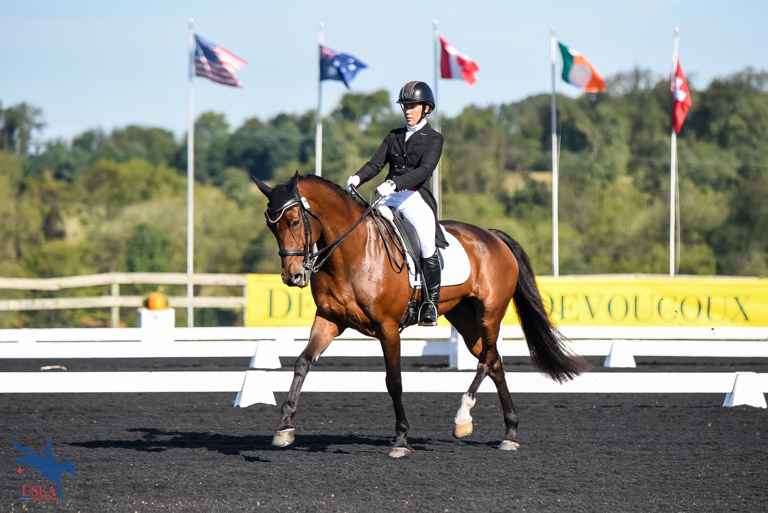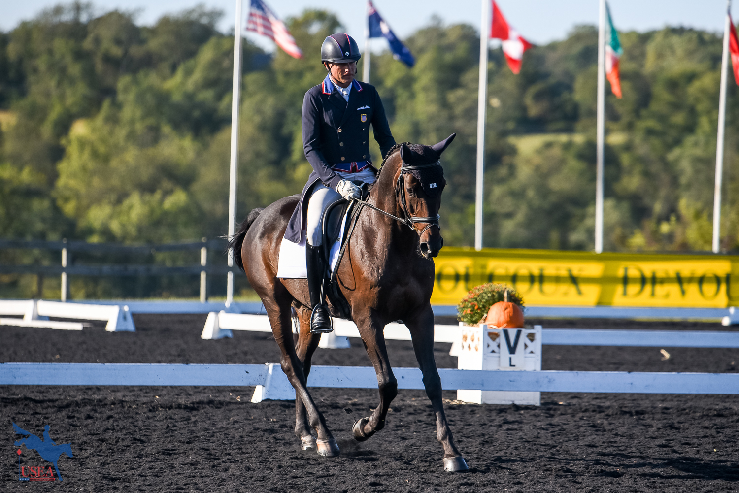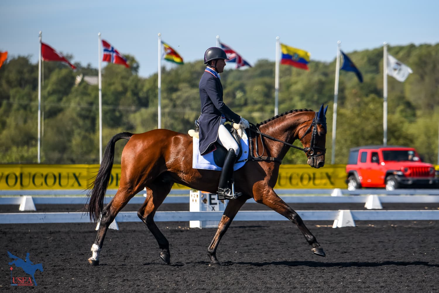 “Usually I try to keep him quiet and relaxed and keep all the work good going up to the event,” Sylvester explained. “He’s been really lazy the last few weeks because it’s hot and dry – he’s not a fan of this kind of weather – and so I honestly tuned him up a little bit and made him work really hard. He can be quiet in the warmup and then light up in the ring, which is what he did at Great Meadow, worse than I’ve ever felt him do, and so I really overrode the warmup and he got upset a few times but then he was exactly the same horse when I got him in the ring, which I’ve never quite had from him. He usually gets some degree of tense when he goes down centerline and today he was being kind of wild in the warmup and he got tired from that. He still had a little bit of tension but it seemed like he worked out a lot of stuff in the warmup and was more focused in the ring.”