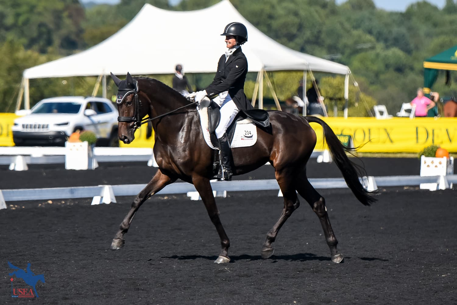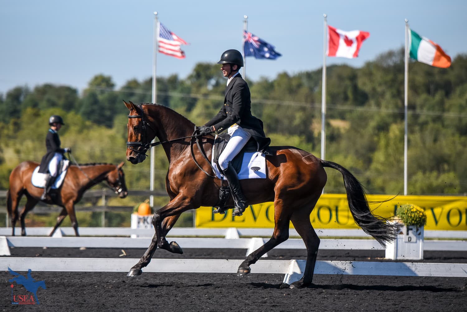 Erin Sylvester and Paddy the Caddy (Azamore x Slamy) held the lead throughout the morning session on a score of 29.5, the only other score to break into the 20s during today’s dressage. The pair sit in third place going into show jumping tomorrow afternoon.